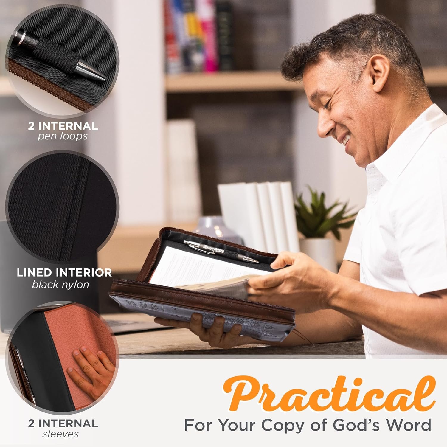 Ensures your Bible stays clean and safe inside. Exterior slip pocket provides extra space for organization. Slip your loose notes, bulletins, or tissues inside for easy storage.