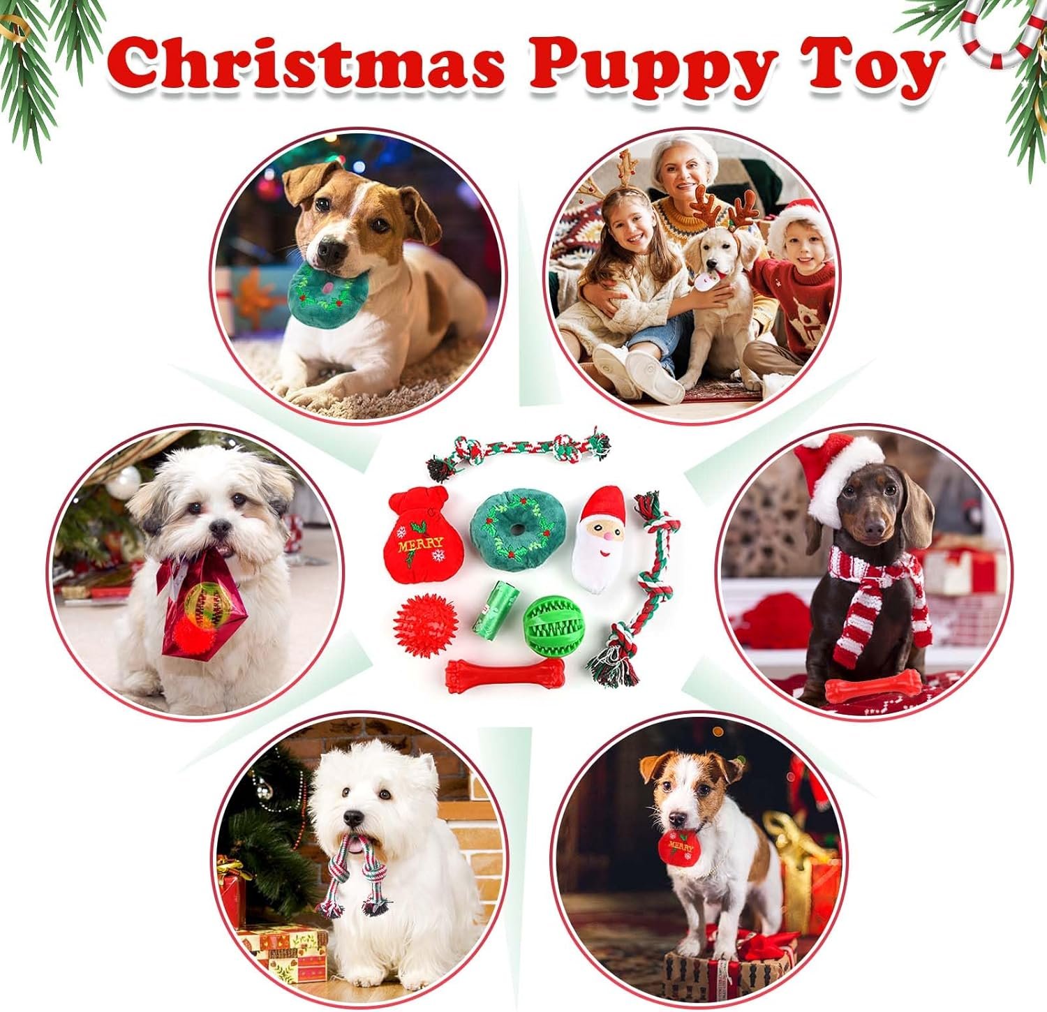 Christmas Dog Toys for Puppy: Great for puppy dogs (under 25 Lbs), including 2 rope toys, 3 squeaky plush toys, 1 rubber chew toys, 1 treat ball, 1 dog bag rolls and 1 dog ball. Make your puppy having healthy chewing behavior by our Xmas dog teething toys.