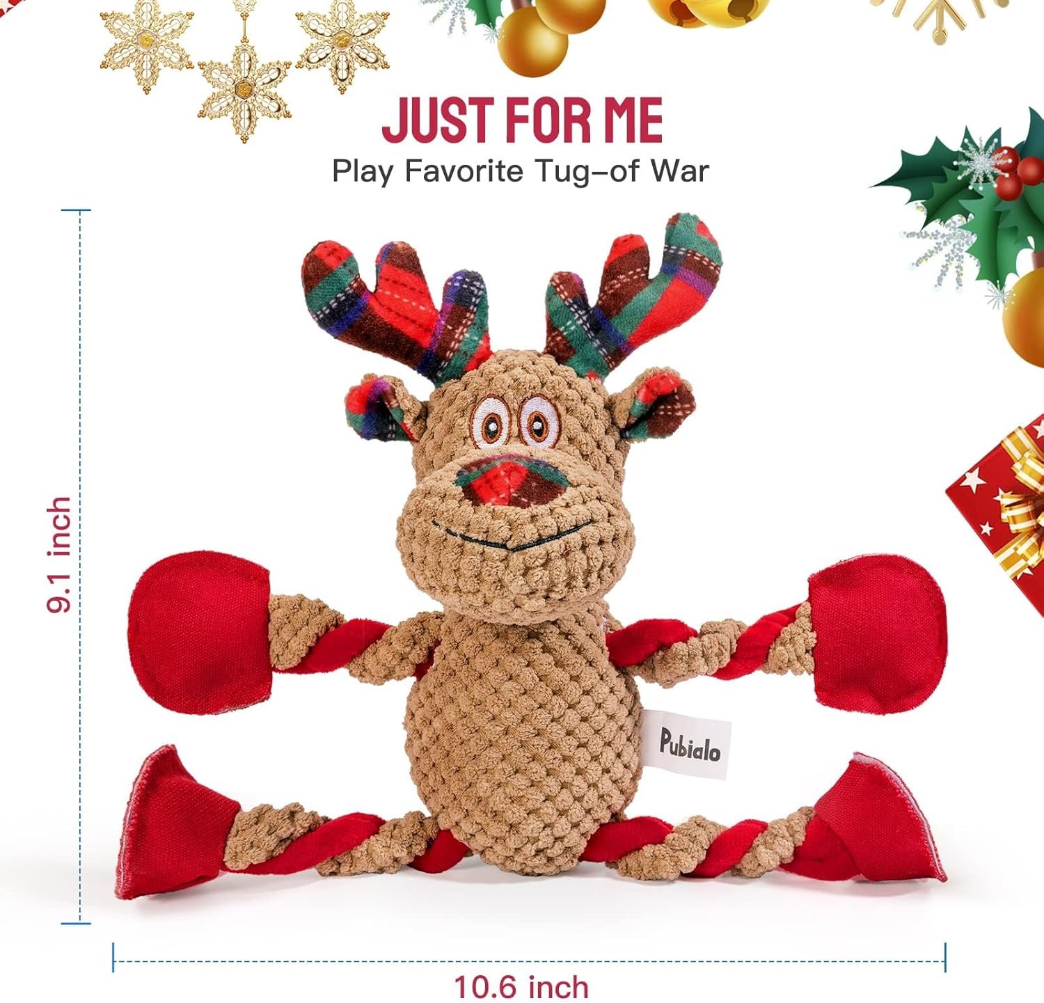 Soft Plush Material-Christmas Dog Squeaky Toy: Pubialo dog toy the best gift of your dog Christmas surprise, let your puppies have an exclusive Merry Christmas! Dog stuffed toys with crinkle material for small and medium breed makes with an ultra-soft plush material with a cuddly natural cotton texture, very safety to your dogs, also legs make the toy more durable and bite-resistant that is a perfect cuddle buddy.