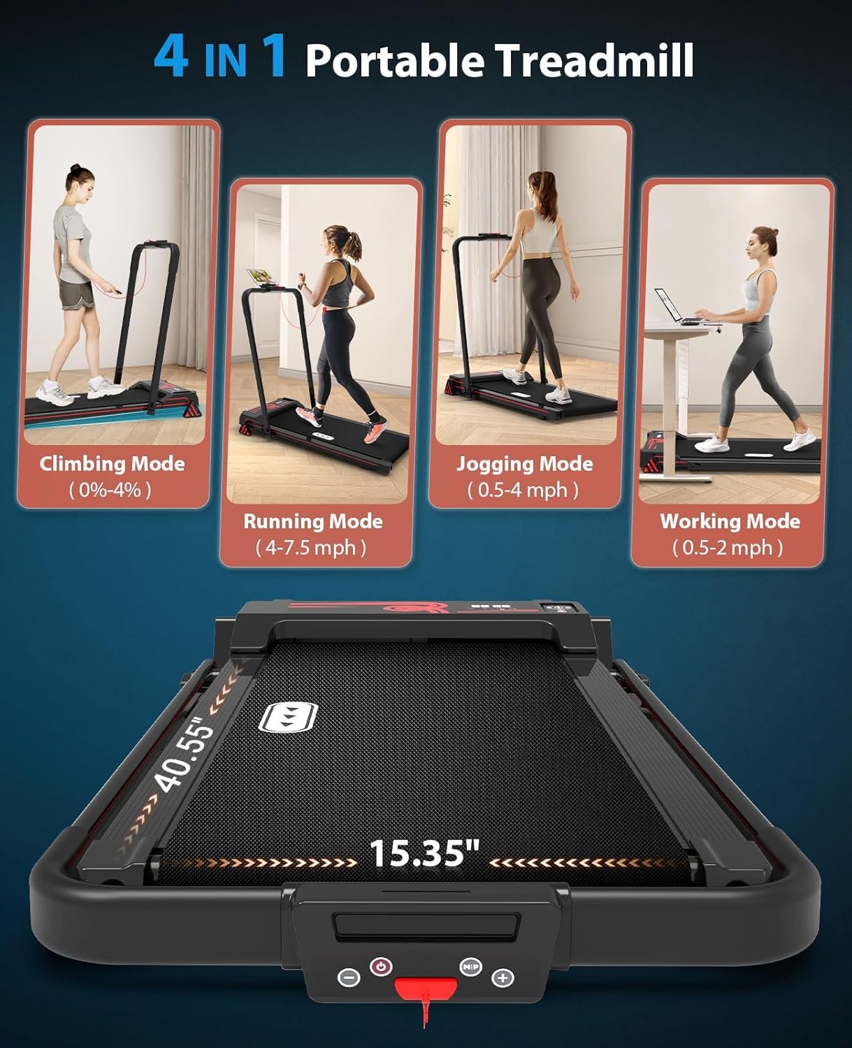 【Innovative 4 in 1 Folding Treadmill】This walking pad treadmill can be used as under desk walking pad with handle down, 0.5-4mph for walk/jog. Handle up, 0.5-7.5mph for fast run. Also, it has 3 manual incline levels for climbing. 0%-4% incline switches in 1 step. Experience a more effective muscle workout and burn calories fast.
