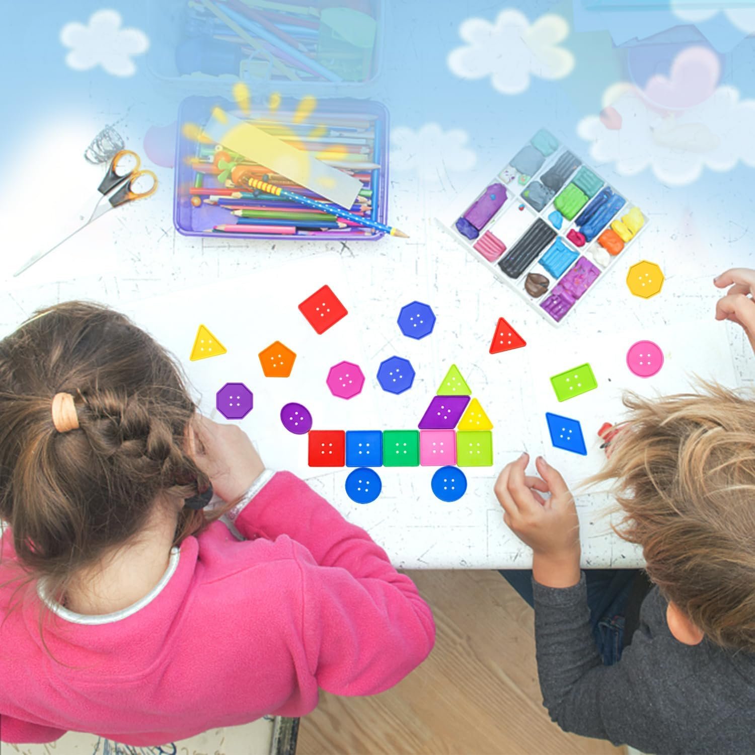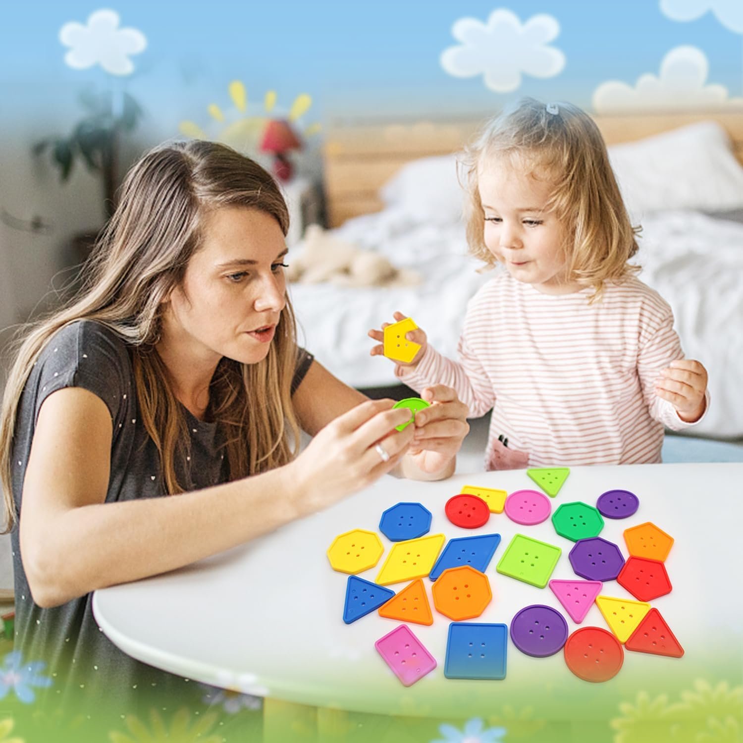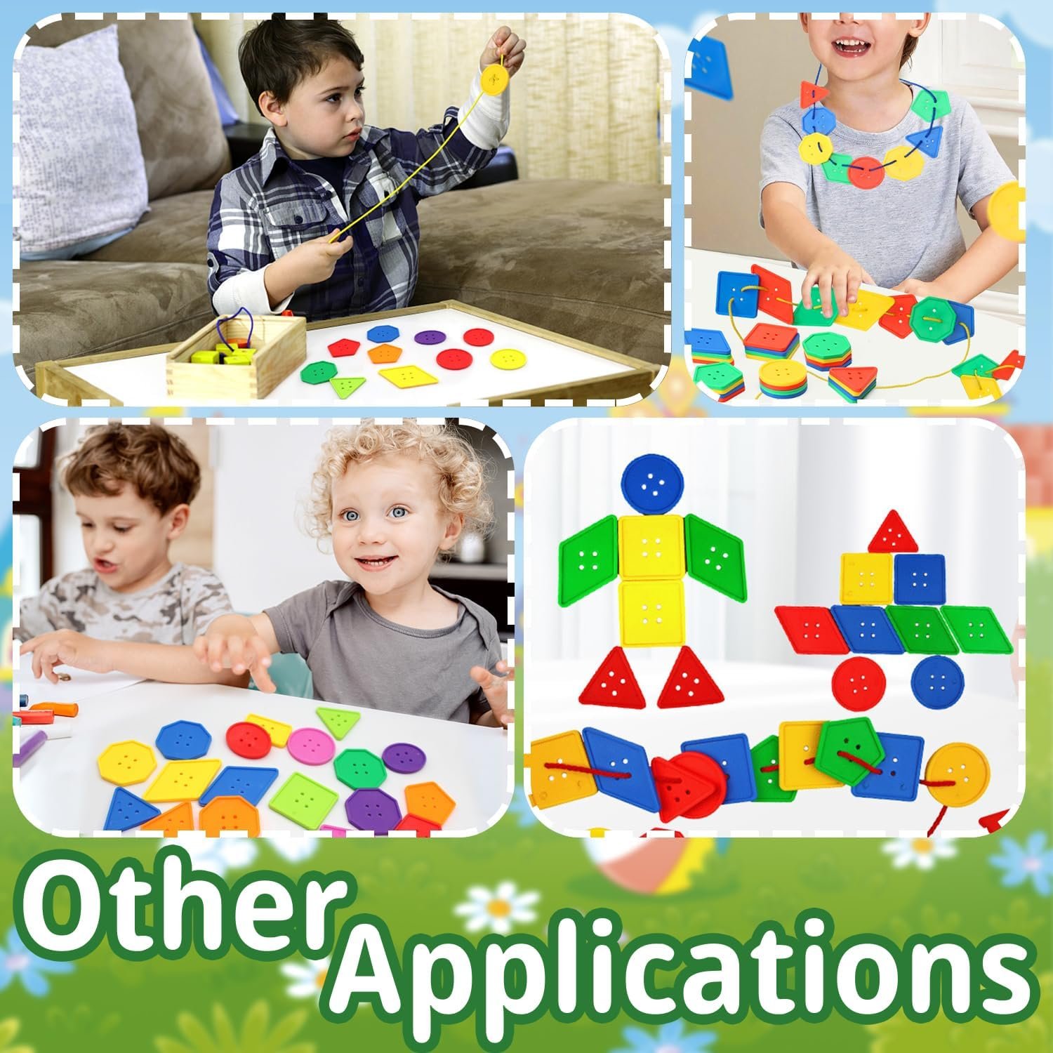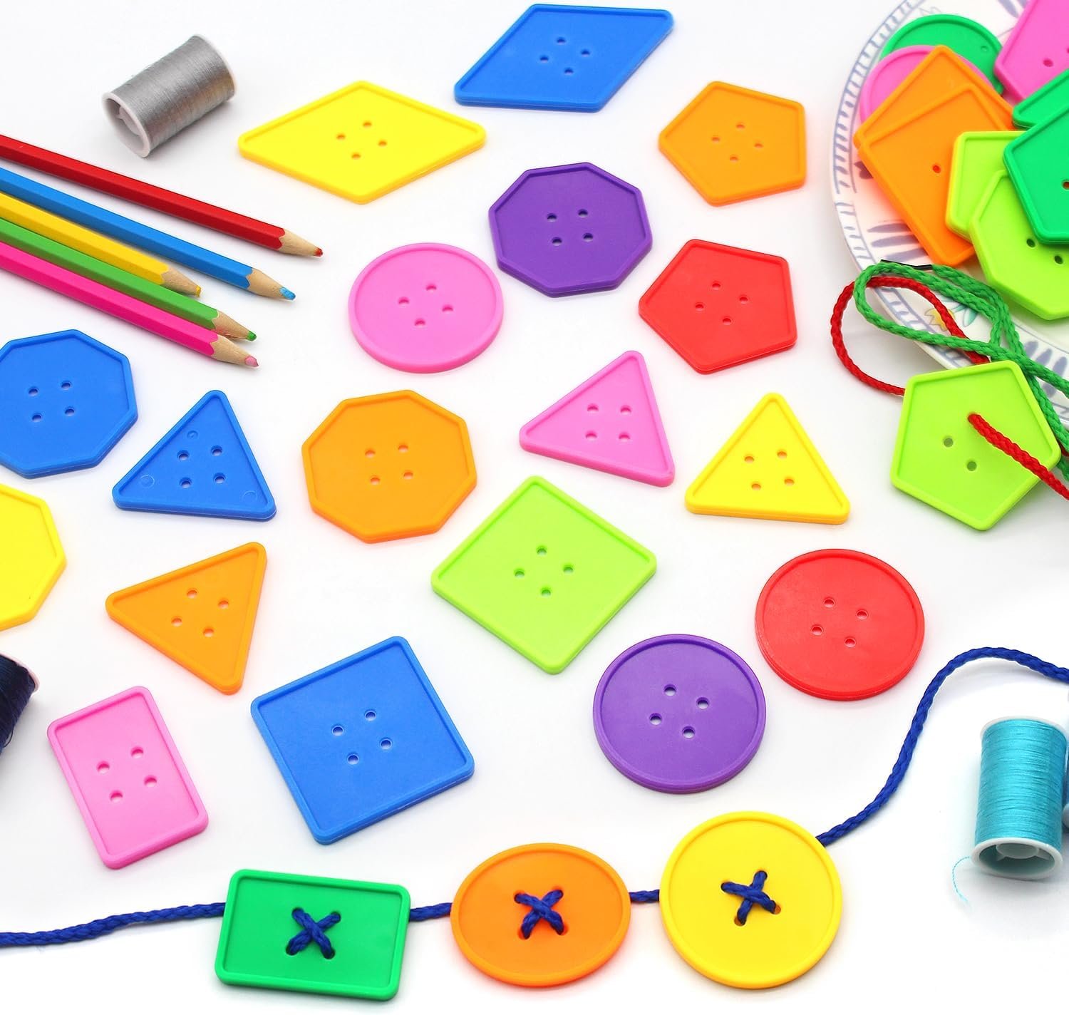 lacing, practicing sorting shapes and colors. Large plastic buttons in 8 different shapes like triangle, square, rectangle, diamond, pentagon,
