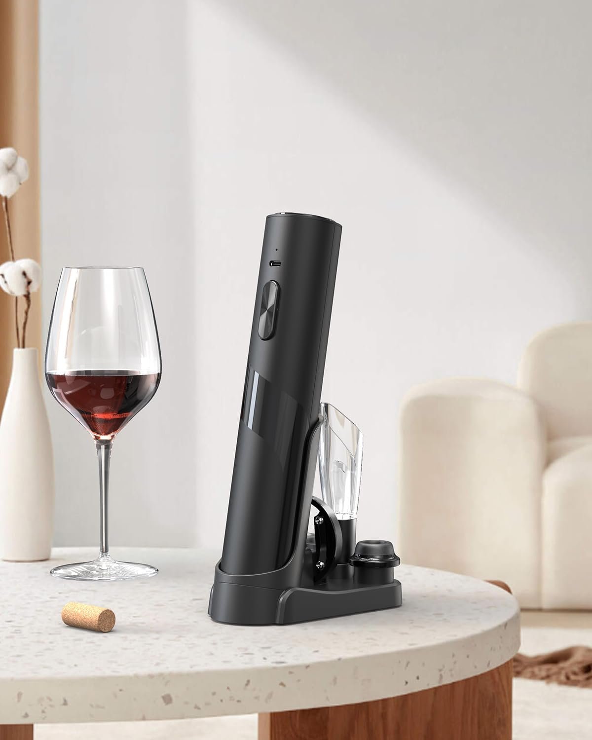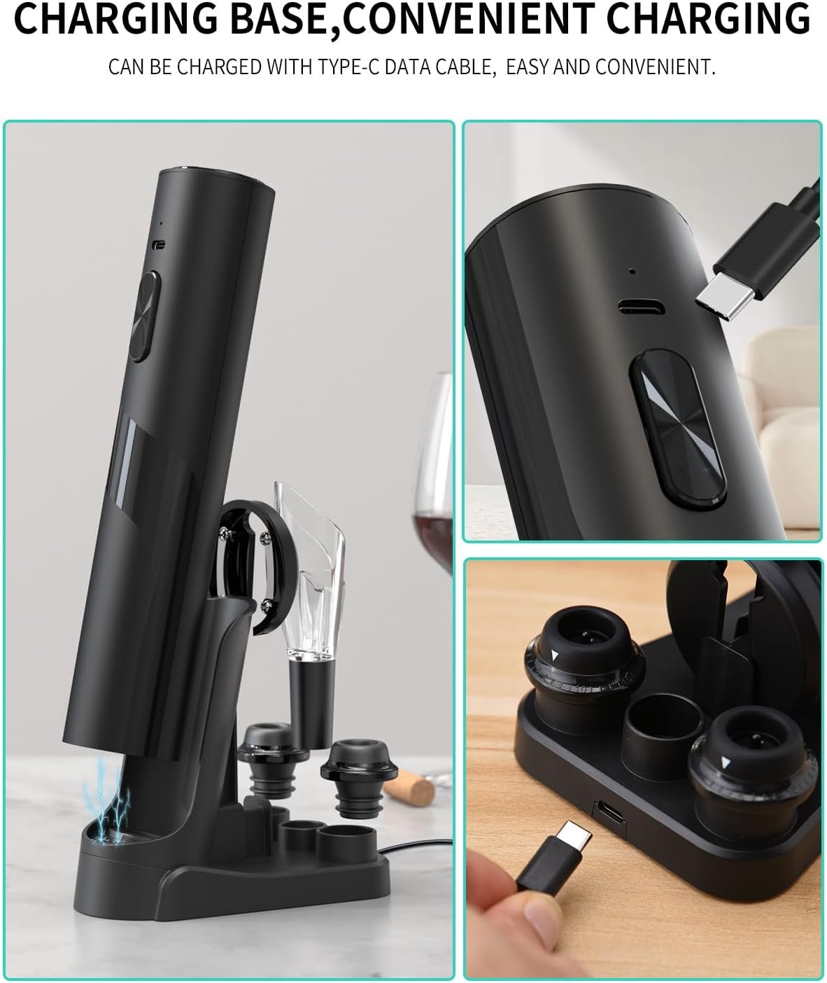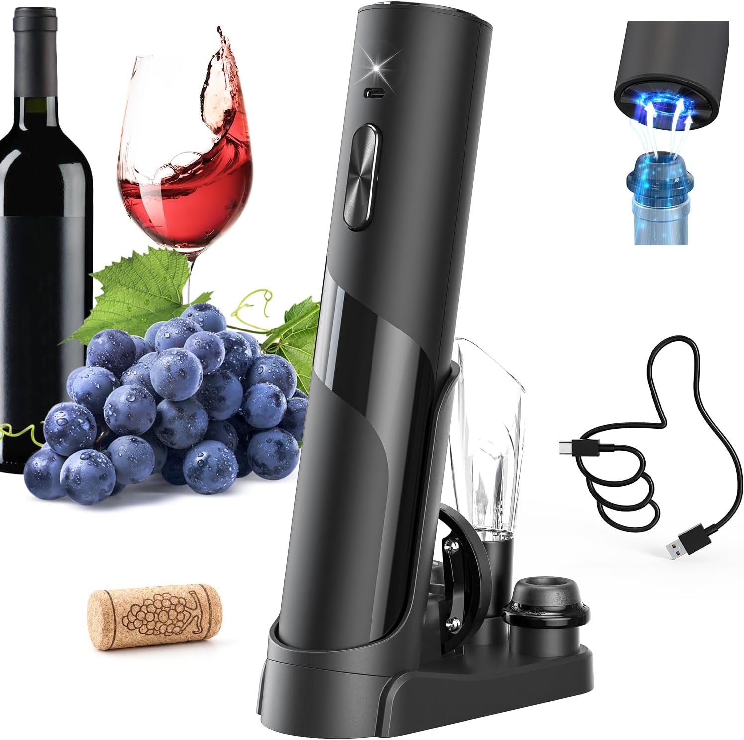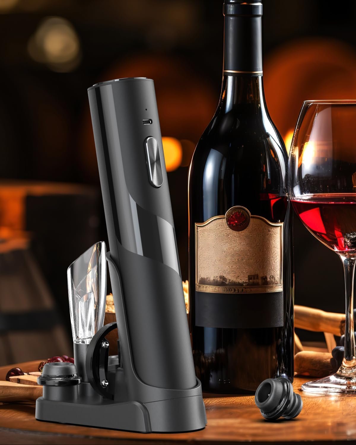 ✔️POWERFUL & RECHARGEABLE – Charge the electric corkscrew seamlessly using the USB-C port or the accompanying base, both included. A built-in charge indicator ensures you’re always ready to uncork. A full charge offers the capability to open up to 60 bottles consecutively