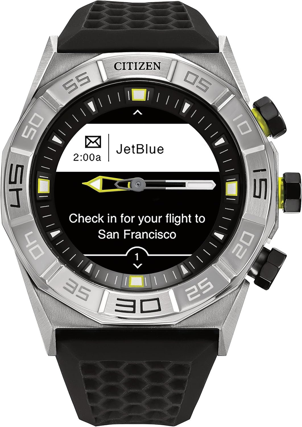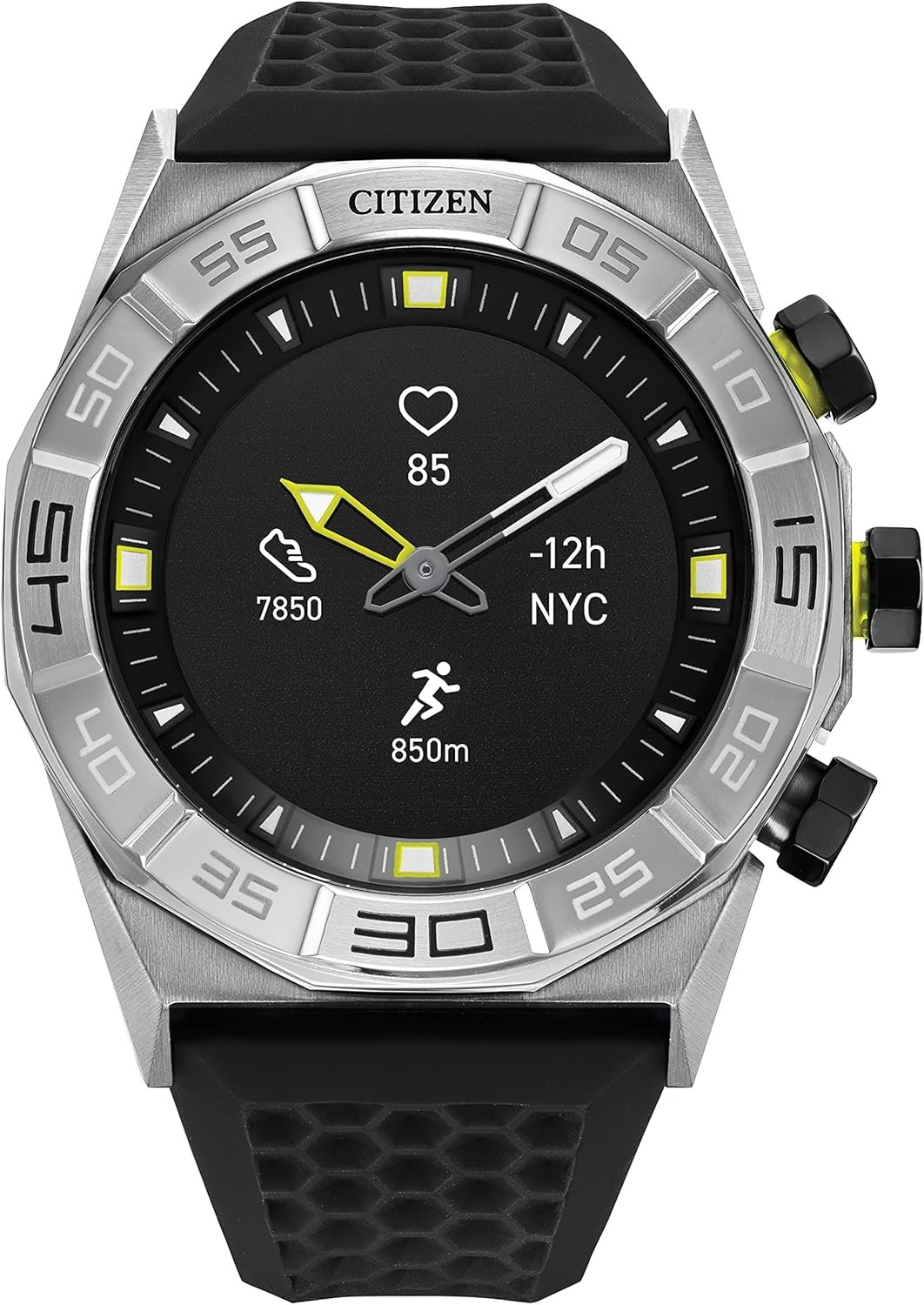 CZ Smart hybrid has the distinct Citizen style with all the best functions of a smartwatch. CZ Smart hybrid leads the way with an iconic design, luminous analog hands, a unique sport bezel and functioning dials on the black and white display. This 44mm stainless steel watch is designed with a stainless steel sport bezel and case with pops of yellow on the pushers and hands. The distinctive white silicone integrated strap blends with the overall design and fits perfectly to your wrist. And with an impressive 15 day battery, this watch can keep up with anything your week throws your way. Utilize the Citizen Connected app to manage your notifications, change your dials and see your fitness stats.