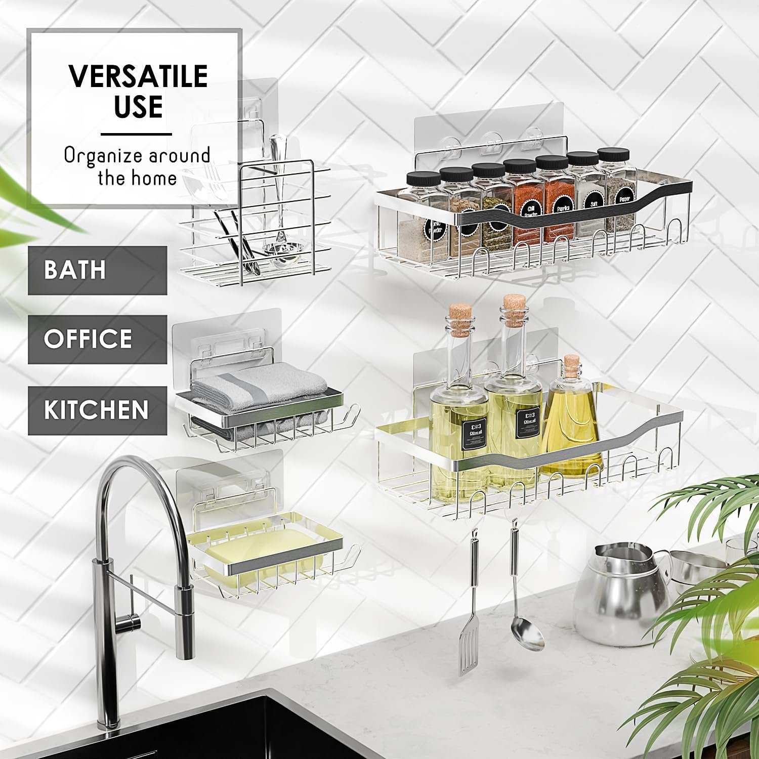 Complete Shower Shelf for Inside Shower Set: The set includes two shower caddies, two soap trays, one toothbrush holder and adhesive hooks, providing ample storage and organization for all your shower essentials. The extra strong adhesion ensures a secure hold on smooth surfaces.