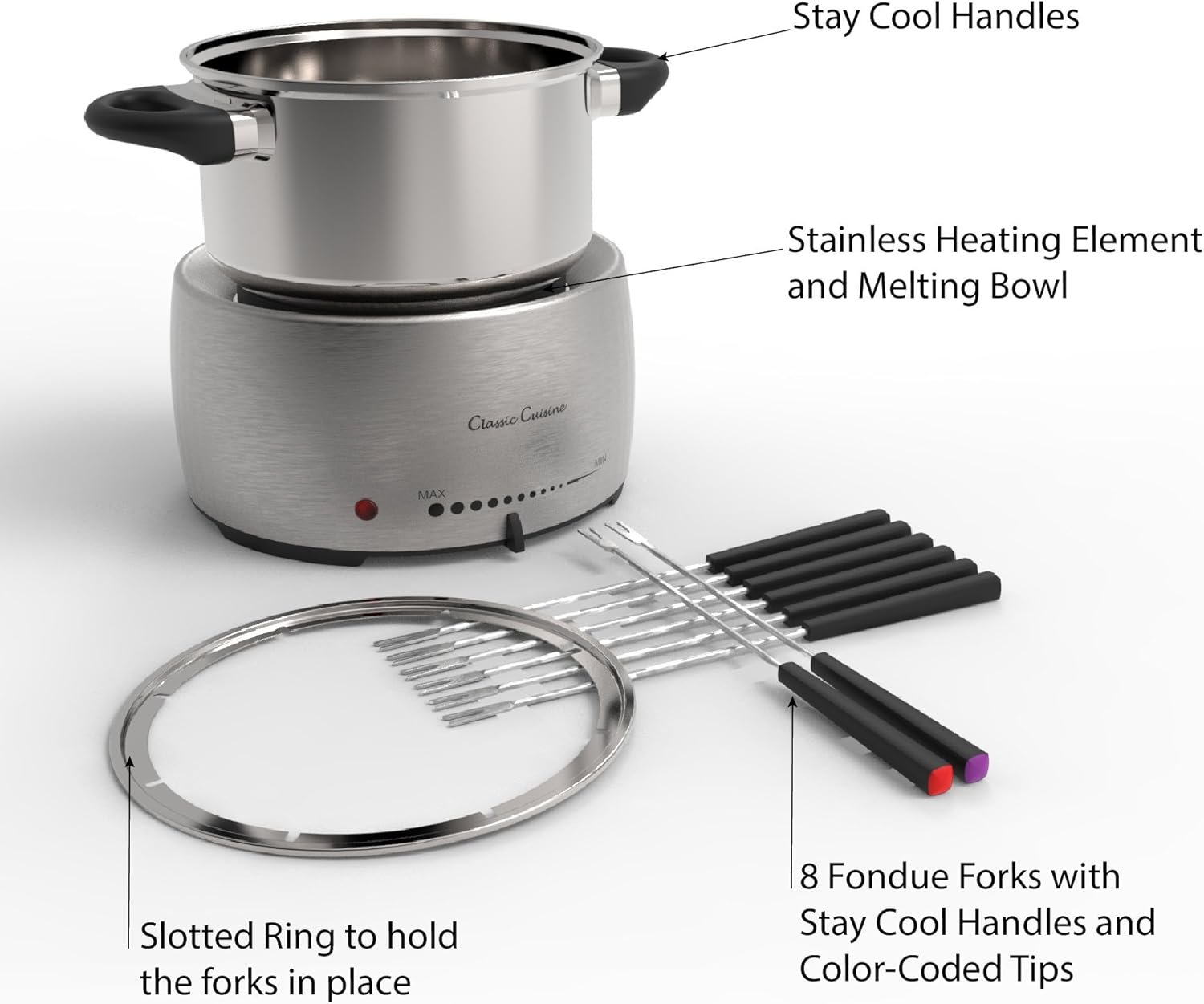 SAFE AND CONVENIENT- With stainless steel construction, this fondue maker was designed with safety and reliability in mind. The set includes a raised warmer to protect countertops and a ring fork holder help to prevent burns from the fondue sticks sliding into your hot ingredients. Additionally, each of the 8 forks feature color coded, stay cool handles for added convenience for identifying your own fork and for protection.