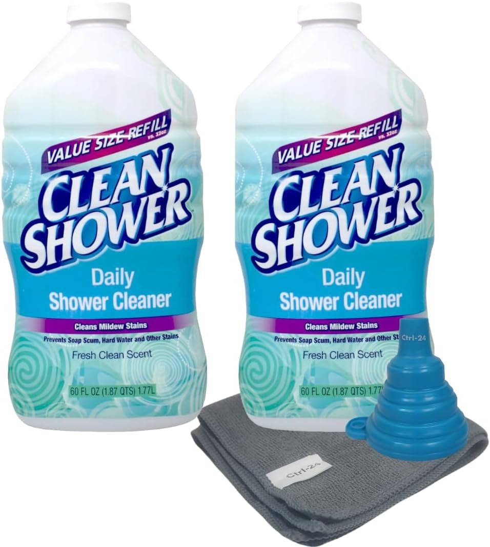 Bundle includes 2 60z Clean Shower Refills, a collapsible funnel and a Microfiber ClothBundle includes 2 60z Clean Shower Refills, a collapsible funnel and a Microfiber Cloth