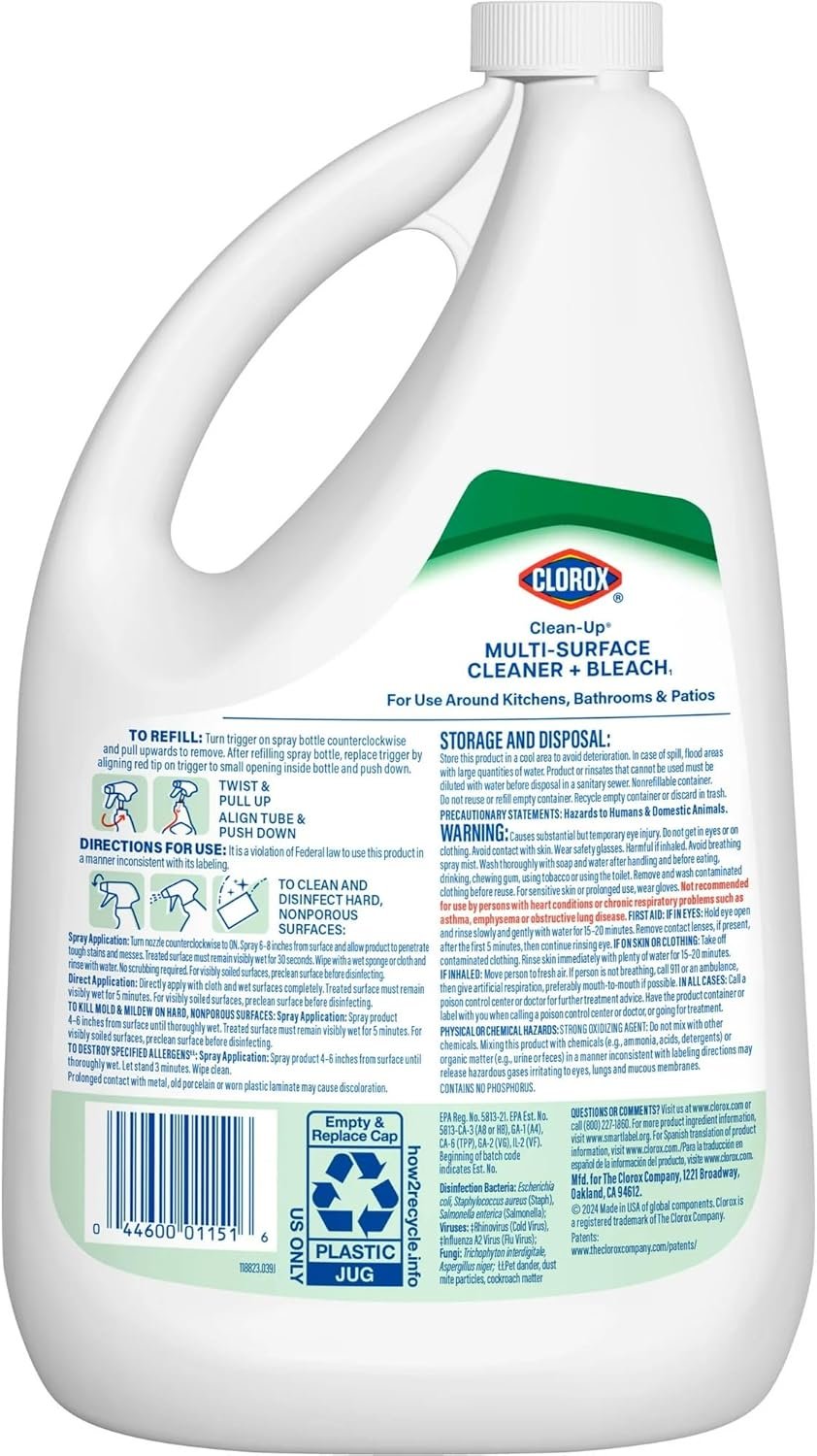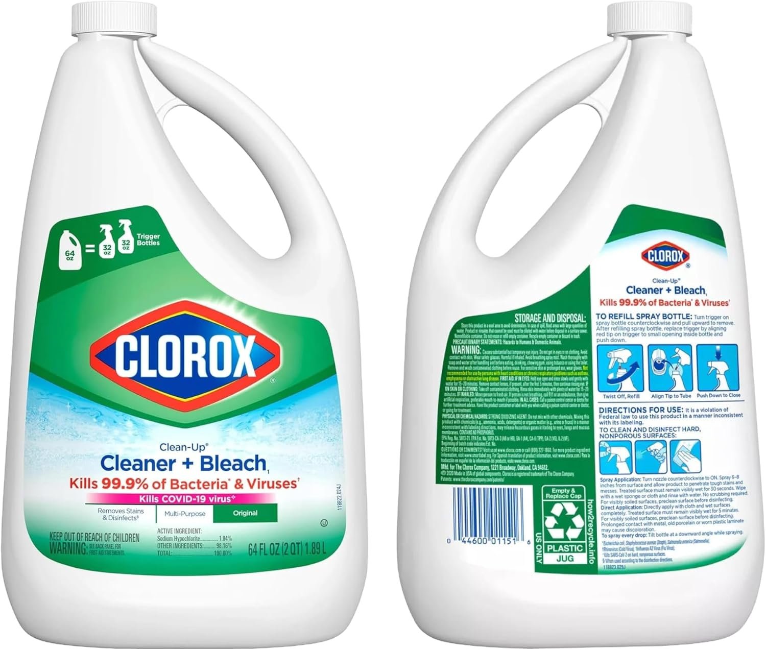 This comprehensive cleaning bundle includes two 64 oz bottles of Clorox Clean-Up All-Purpose Cleaner, designed to effectively tackle tough stains and dirt across multiple surfaces. Our powerful formula is ideal for kitchens, bathrooms, and outdoor spaces, providing a thorough clean. The bundle features a collapsible funnel for easy refilling and latex gloves for protection while cleaning. Keep your home fresh and clean with this reliable solution.