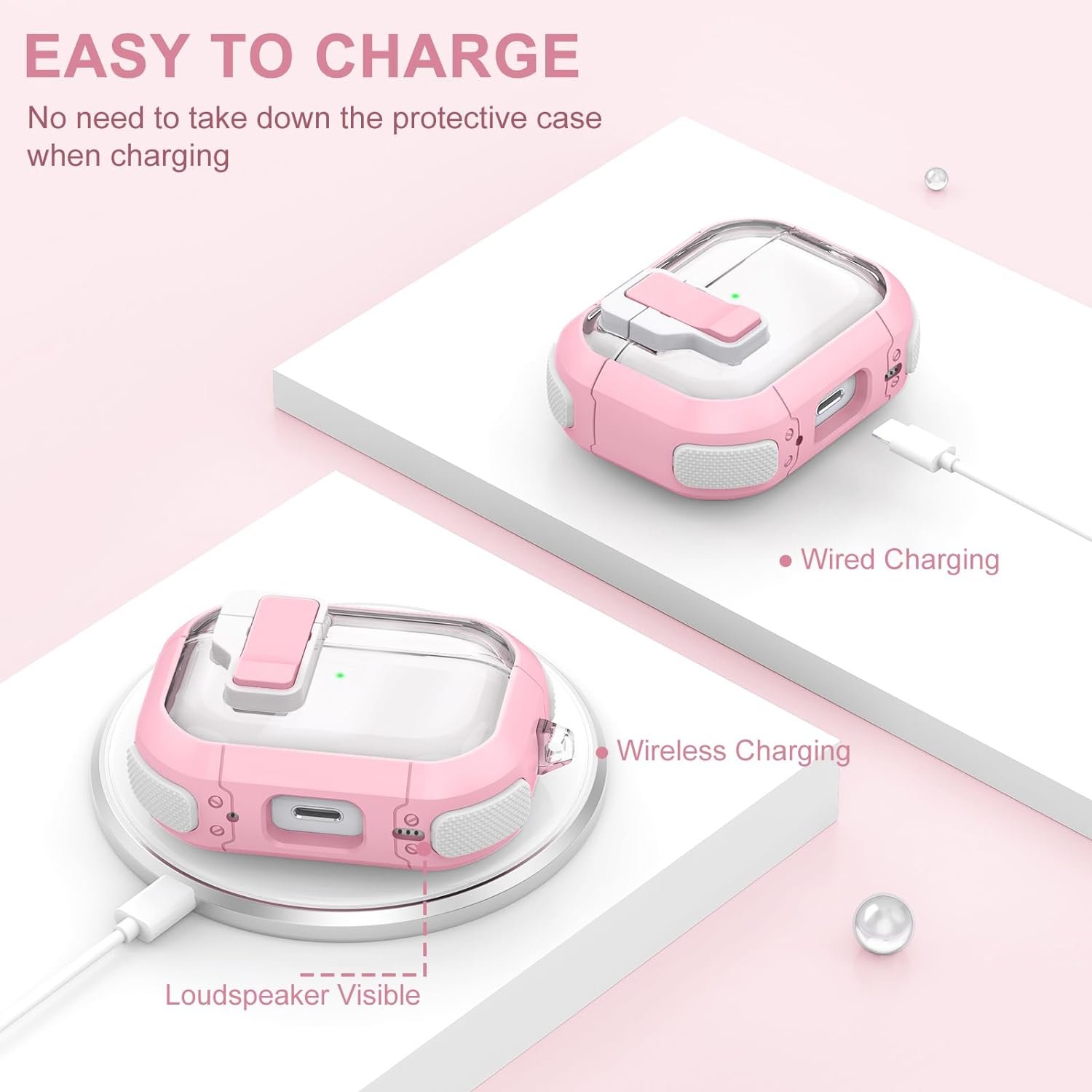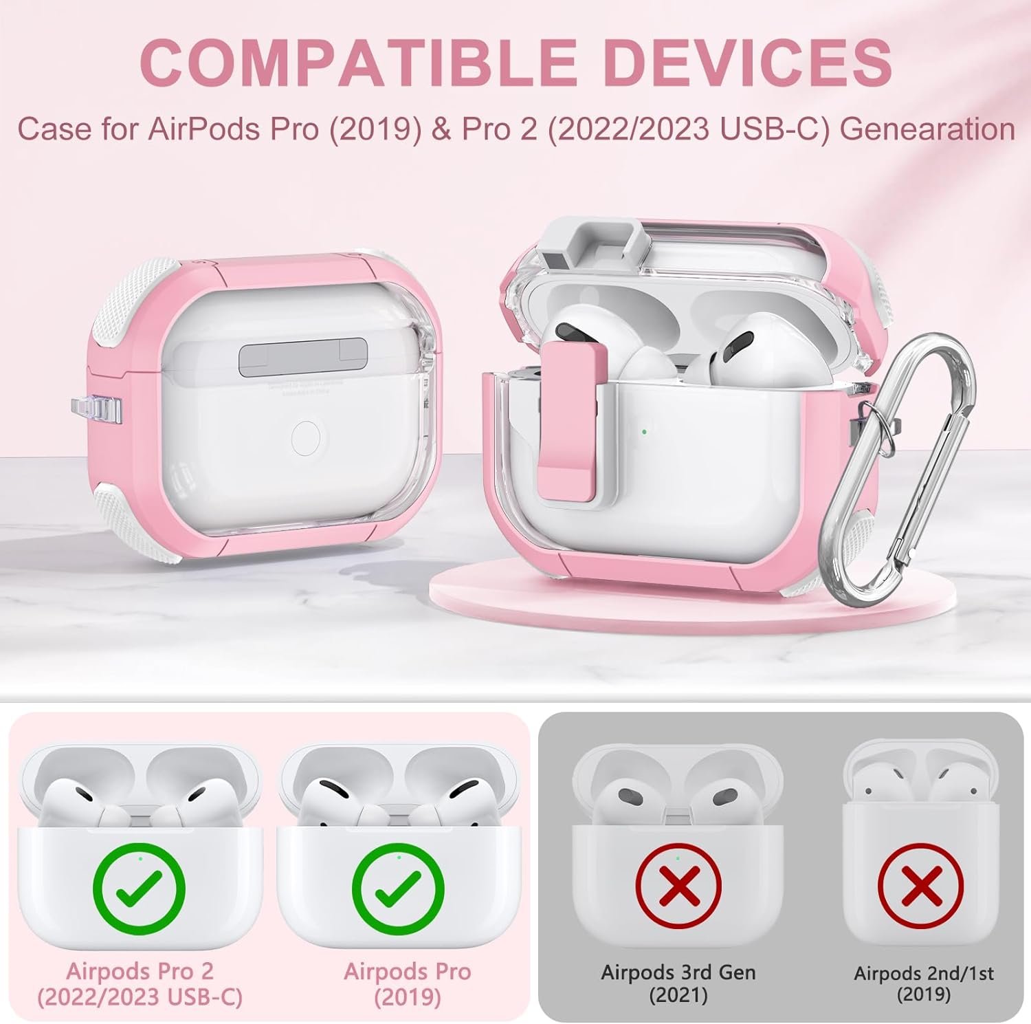 Compatible Device: Ekoonpft military graded hard shell protective clear case with secure lock designed available exclusively for Apple 1AirPods Pro 2 Generation USB-C(2023),1AirPods Pro 2 Generation (2022) ,1AirPods Pro 1st Generation (2019). PRECISE HOLE POSITION: The bottom of case has a precisely cut charging portm, (Wired + Wireless) Charging with case, no need to take off . (Tips: The bottom of case only has a charging holde, there without 2 speaker holes for airpods pro 2).