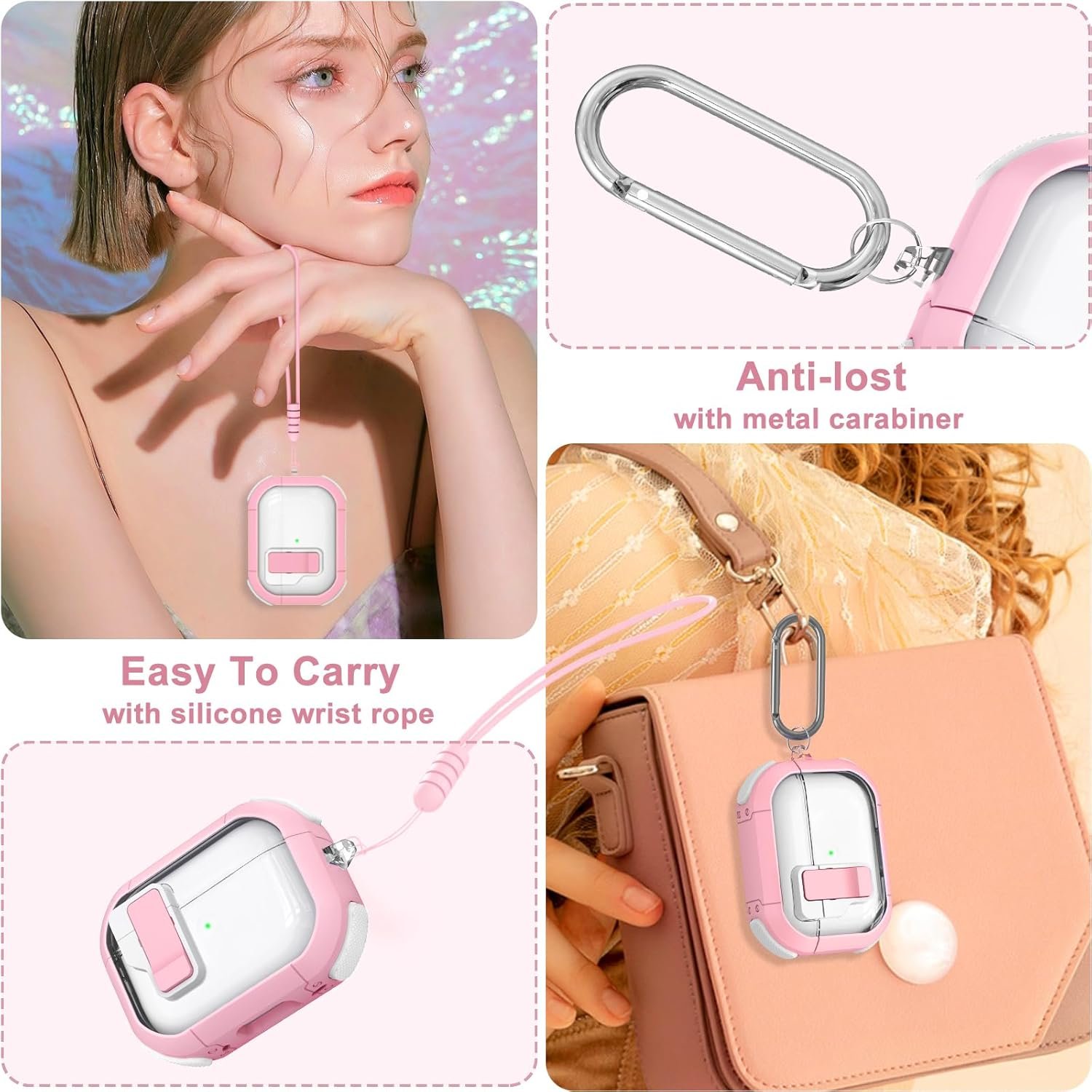 Secure Lock Clip: The lock of thecase has a square mutually Repels Magnetic block embedded above and below so that open top cover just need “One Click” will pop up! Precise fit, Smoother one-handed opening!This case adopts a split structure 2 pieces design and has upgrated automatic lock clip on the front of case to avoid the accidental loss of the earphone when airpods case fall