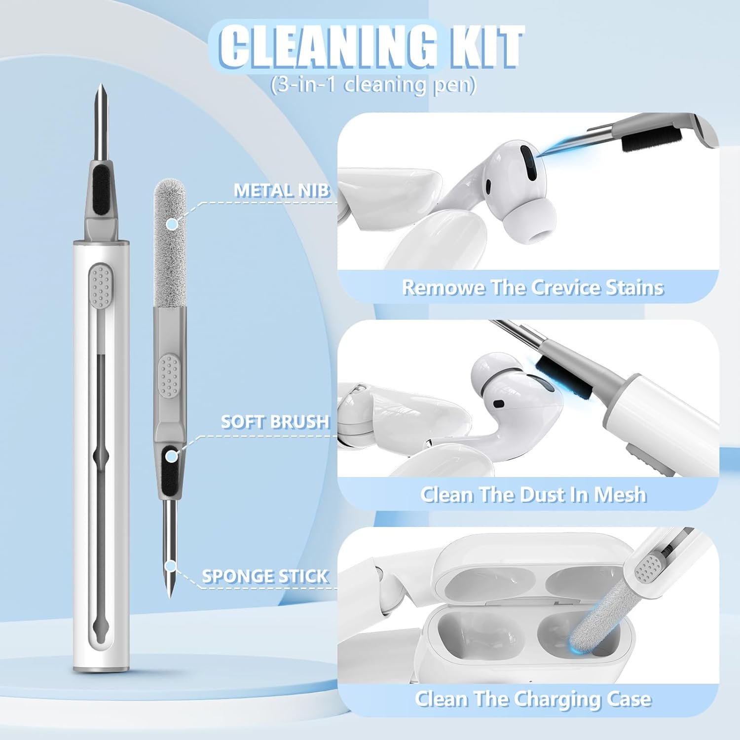Multi-Functional Cleaning Pen: The Airpods cleaner Kit has metal nib to remove dirt from hidden cracks and holes. The high-density brush can easily clean the dirt on the sound hole of the earphone. The soft flocked sponge absorbs fine dust inside the wireless earbuds charging case