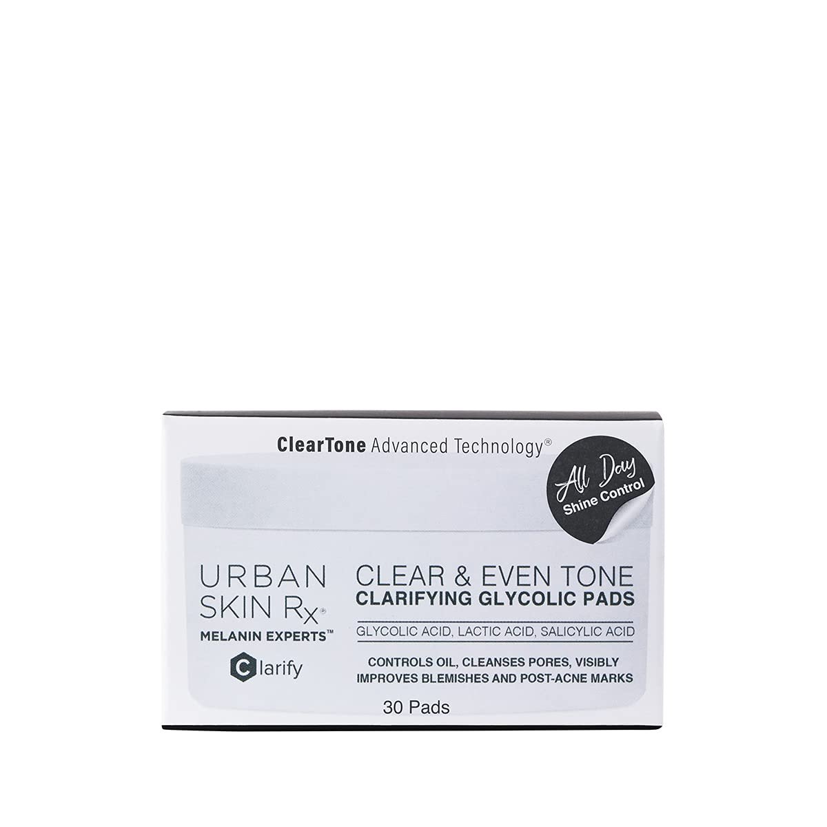 ABOUT THE PRODUCT: The Urban Skin Rx Clear & Even Tone Clarifying Glycolic Pads contain a powerful combination of ingredients that effectively exfoliate dead skin cells, promote the appearance of even skin tone, remove excess oil, and leave behind a cleansing formula that targets current and future blemishes. Includes 30 multipurpose textured, round pads soaked in a clarifying solution that feels cool on contact.