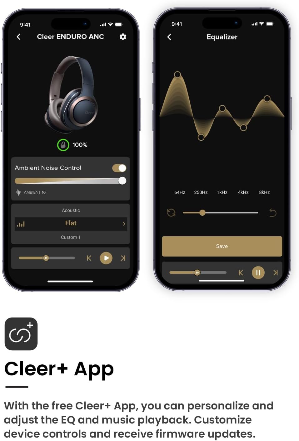 Cleer+ App: It allows you to personalize your audio experience through preset or customized equalizers (EQs). Easily adjust the Noise Cancelling and Ambient Noise settings on your over-ear headphones for enhanced awareness, and ensure you stay informed with the latest firmware updates.