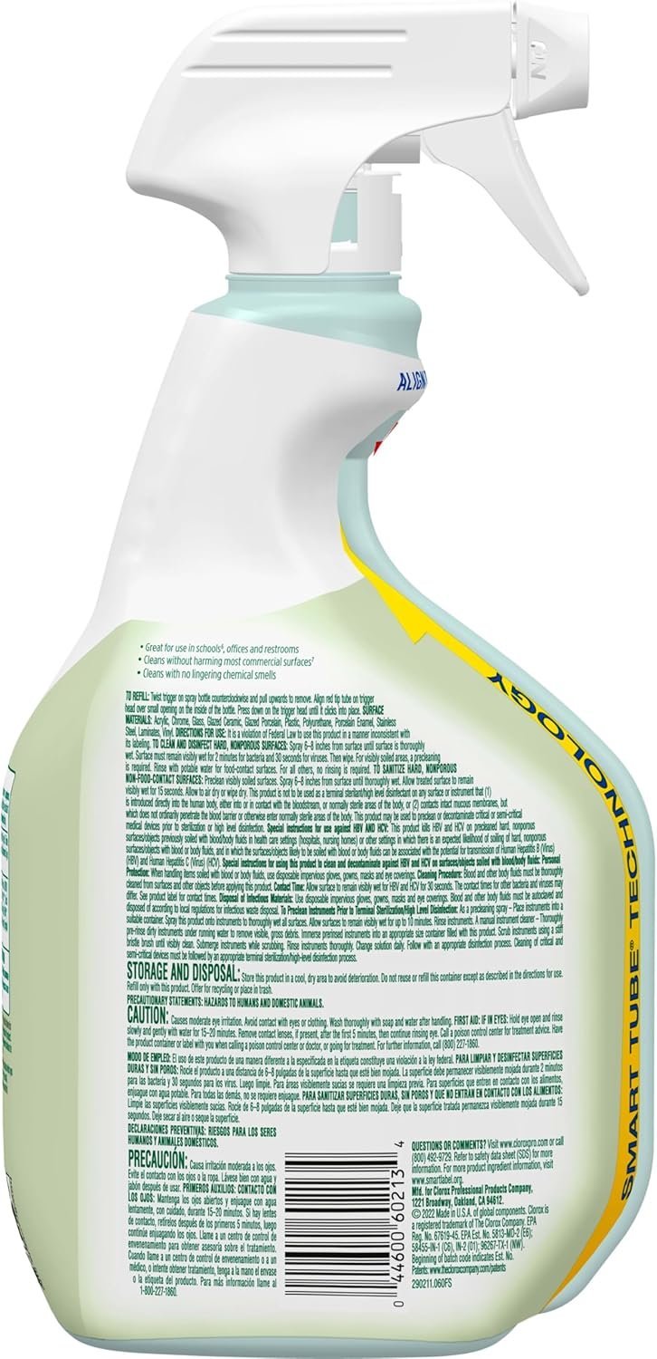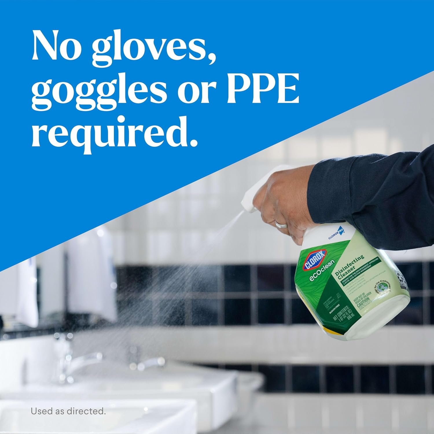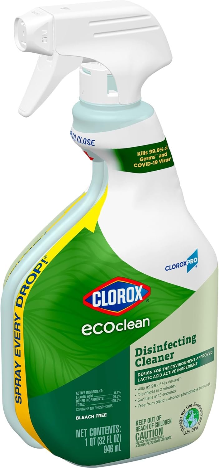Clean with confidence. Thanks to Clorox EcoClean Disinfecting Cleaner, get the cleaning power of Clorox you expect with a Design for the Environment certified lactic acid active ingredient. This Clorox disinfecting cleaner kills 99.9% of flu viruses and disinfects and sanitizes using eco- conscious, Design for the Environment certified ingredients.**. Clorox EcoClean Disinfecting Cleaner is great for everyday use, no gloves or mixing required, and is formulated without bleach, alcohol, phosphates, quat and colorants. This product leaves a clean, fresh scent and is suitable for use in commercial spaces including airports, colleges, dorms, fitness centers, hotels, long-term care facilities, offices, restrooms and waiting rooms. *Human , Influenza A , Respiratory Syncytial **When used as directed.