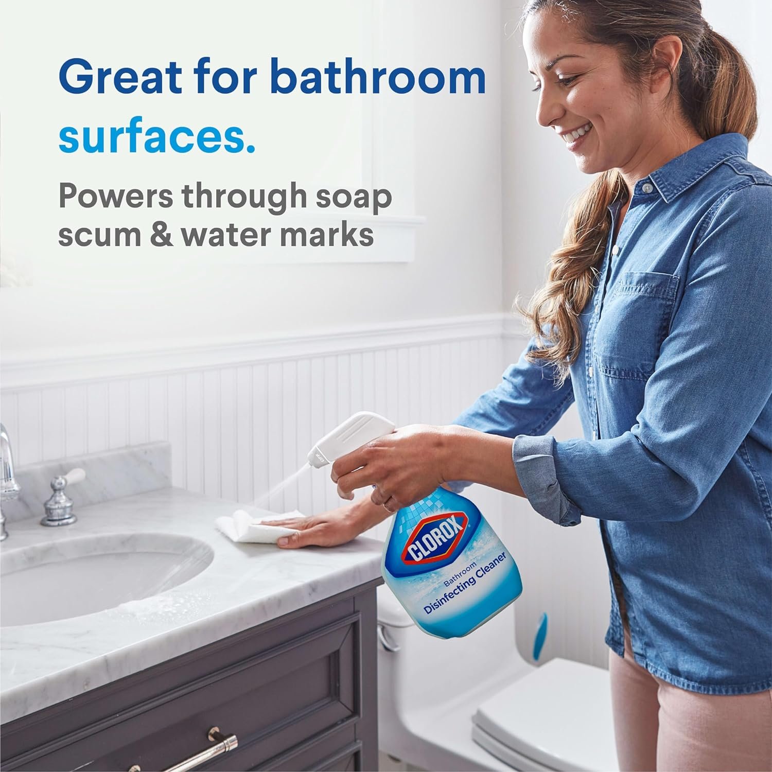 BATHROOM CLEANER: Make your bathroom sparkle with Clorox Disinfecting Bathroom Cleaner in a spray bottle that cleans and disinfects sinks, toilet exteriors and showers