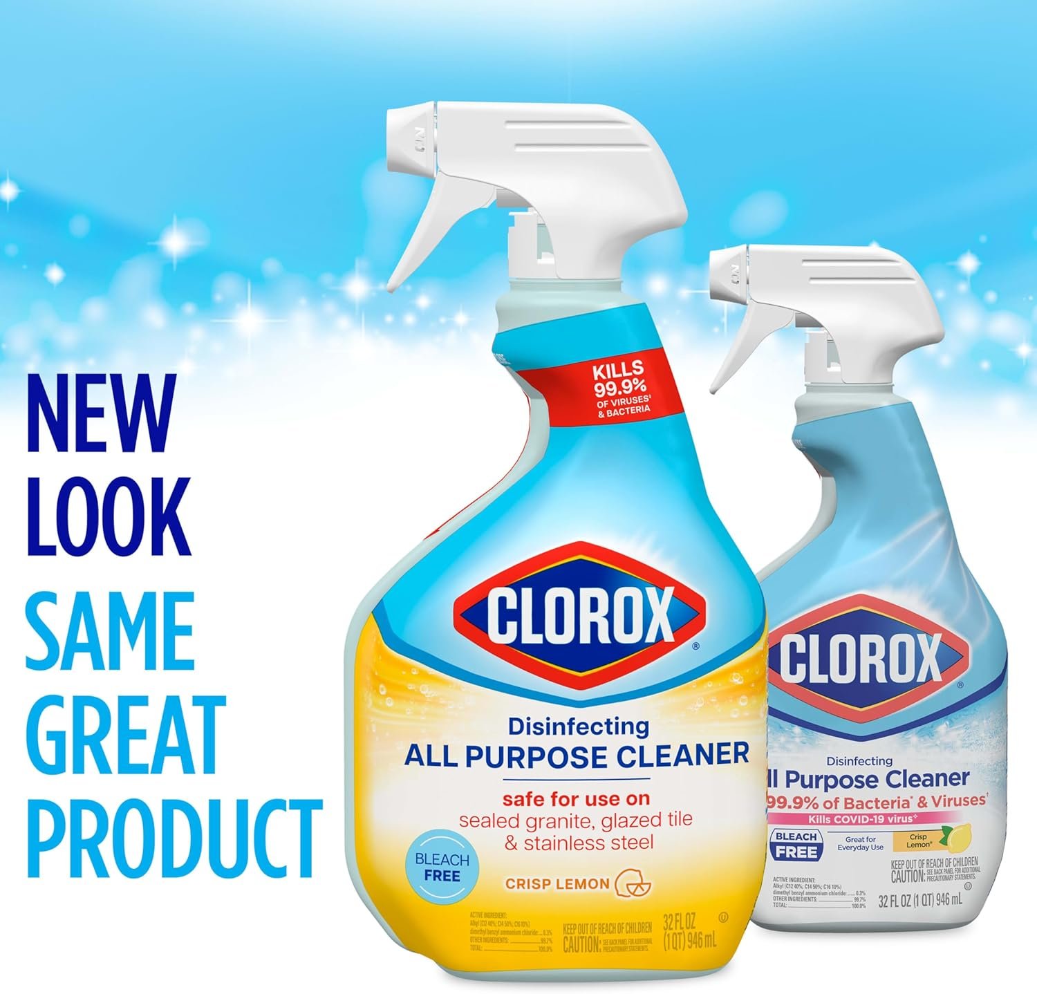 Get Clorox cleaning power without the bleach. Clorox Disinfecting All Purpose Cleaner kills 99.9% of bacteria and viruses and is proven to kill COVID-19, no bleach necessary. Prevents odor-causing bacteria growth on hard, nonporous surfaces for up to 48 hours. Great for everyday use, this Clorox spray is gentle enough to use on many surfaces in your home. Reach for it to clean messes and power through the toughest stains, including grease, grime and soap scum. This disinfecting spray leaves behind a Crisp Lemon scent without the harsh odor of bleach for a sparkling clean experience in your home. Can be used as a household cleaner on multiple hard, nonporous surfaces, including kitchen sinks, counters, refrigerators, appliances, tubs, toilets, fiberglass, floors, showers and tile. With the bottles spray nozzle, you can easily and evenly apply the solution to any surface. The easy to use trigger lets you spray into corners and hard to reach places. This cleaner leaves your home sparkling clean and smelling fresh.