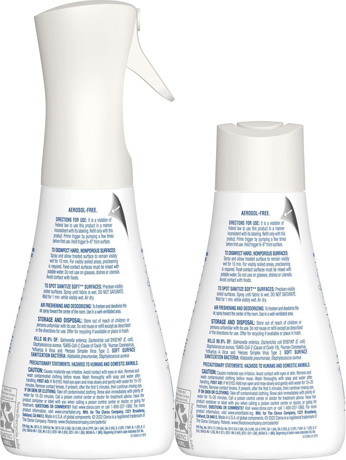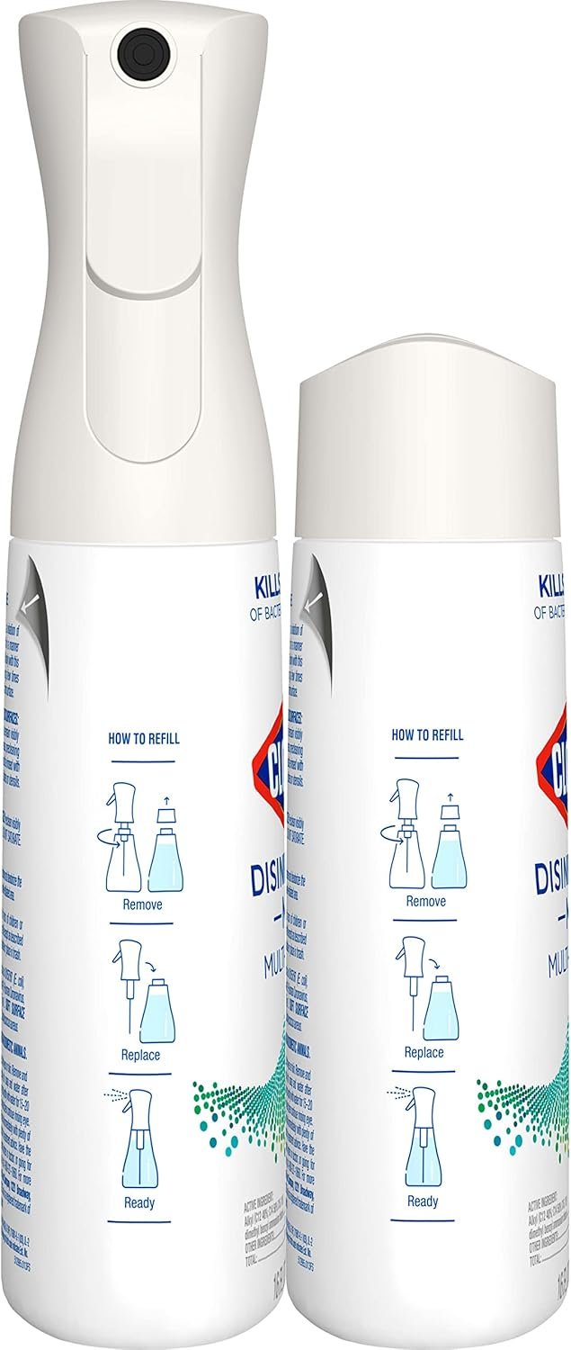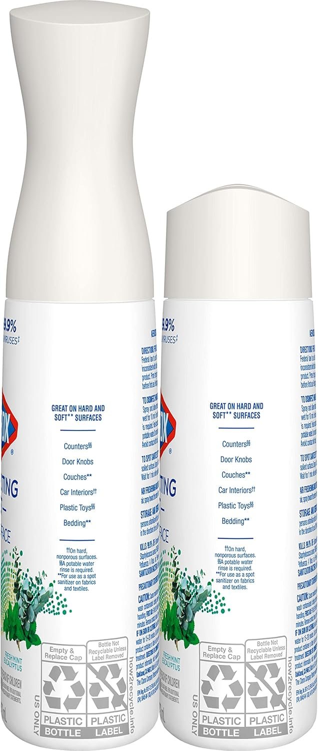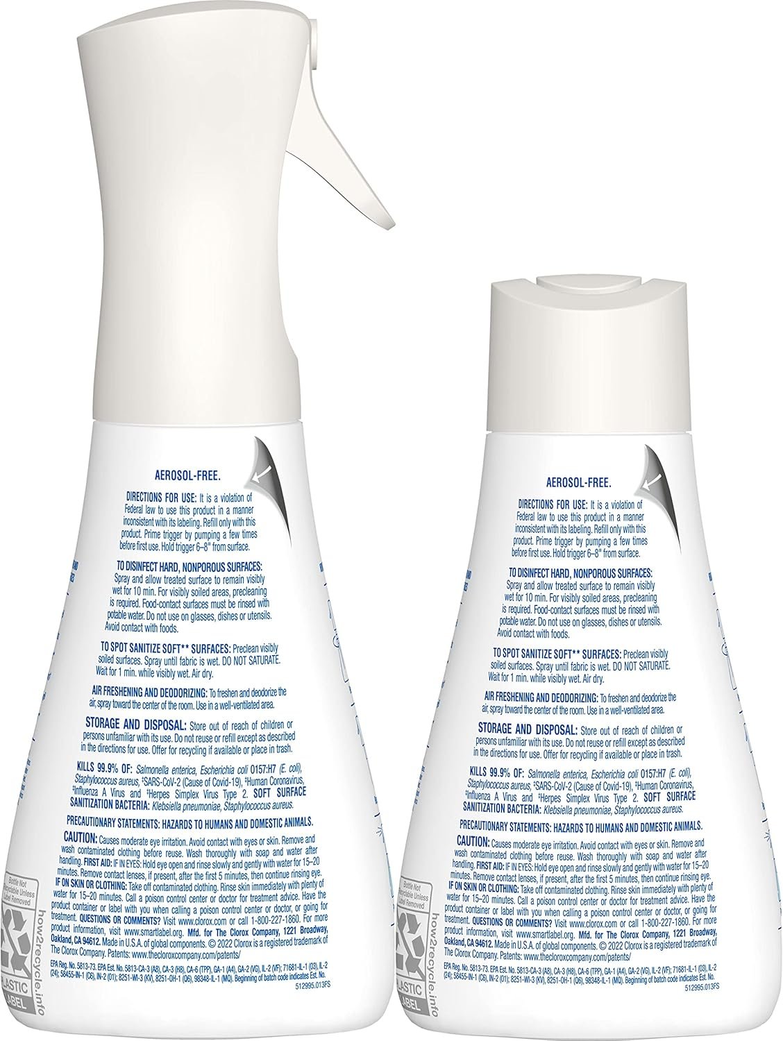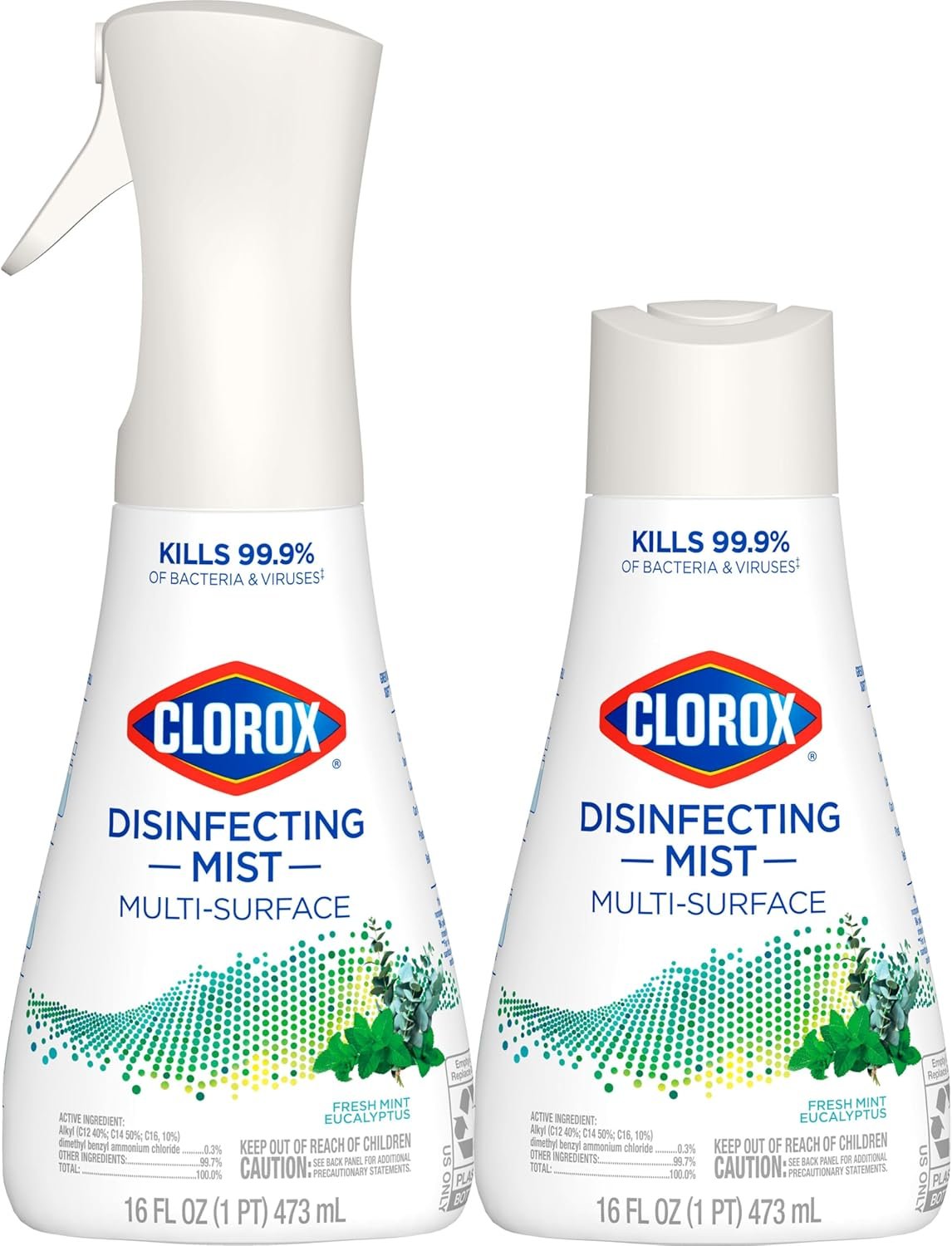 Disinfect hard surfaces*, eliminate odors and sanitize fabrics with Clorox Disinfecting Mist. 3 in 1 disinfectant, deodorizer and fabric refresher* kills 99.9% of bacteria and viruses**, including COVID 19***. Help protect your home from the spread of germs on surfaces, including during cold and flu season* by spraying on high touch surfaces like doorknobs, countertops, and faucets. The continuous sprayer creates a fine mist of the color safe**** formula to sanitize and refresh hard to wash fabrics in your home. *All in one product disinfects hard surfaces, deodorizes the air, and sanitizes bacteria on soft surfaces when used as directed. **Use as directed. See product label for list of organisms. Food contact surfaces must be rinsed with potable water. Pre test in an inconspicuous space before use. Do not use on marble or copper. ***Kills SARS CoV 2 on hard, non porous surfaces. ****When used as directed. *****Use as directed. Rinse required on incidental food contact surfaces.