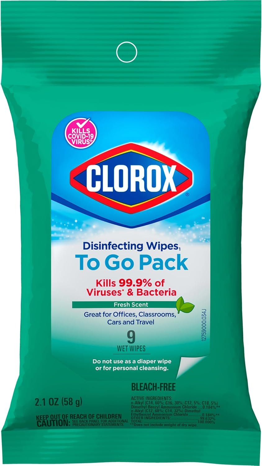Clorox Disinfecting On The Go Travel Wipes, Household Essentials, Fresh Scent, 9 Count, Pack of 1 (Package May Vary)