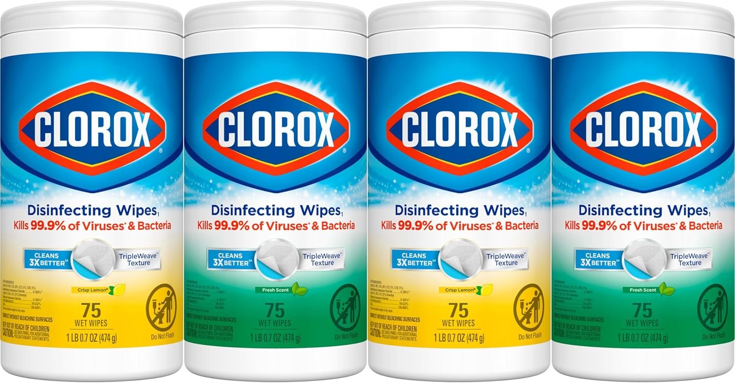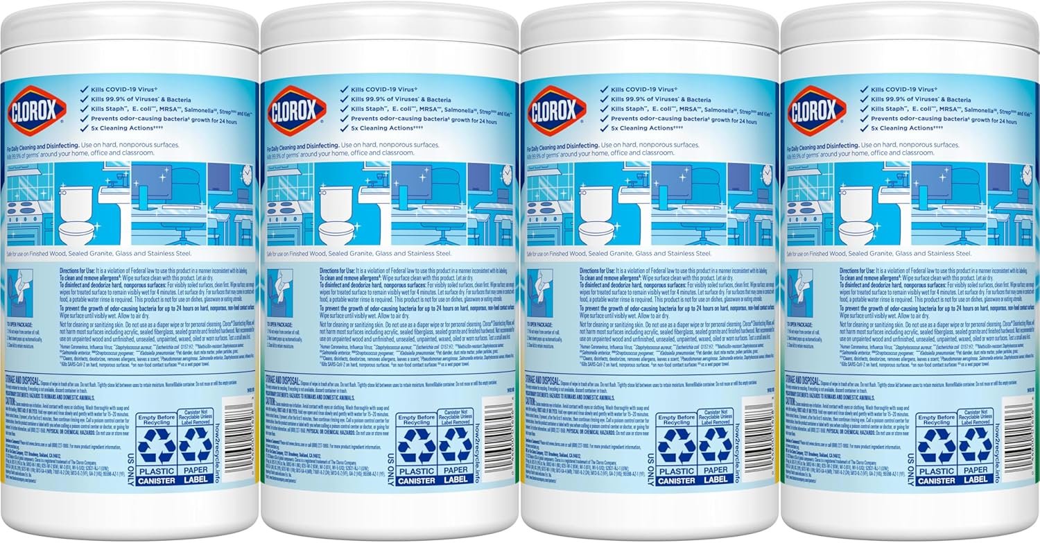Clorox Disinfecting Wipes with TripleWeave texture kill germs, cleans tough messes and removes 99.9% of allergens on surfaces like kitchen counters bathroom surfaces and more. Disinfecting Wipes clean and disinfect with antibacterial power that kills 99.9% of viruses and bacteria that can live on surfaces, including COVID-19* Virus, staph, E. coli, MRSA, salmonella, strep and Kleb. These all-purpose disposable wipes can prevent the growth of bacteria* for up to 24 hours. Wipes are safe to use on finished wood, sealed granite and stainless steel. Clean with bleach-free wipes to keep dirt and germs away. Do not flush. * Kills COVID-19 virus: kills SARS-CoV-2 on hard, nonporous surfaces. Use as directed. Vs. a paper towel. Prevents the growth of bacteria: odor causing bacteria on non-food contact surfaces. Allow product to air dry.