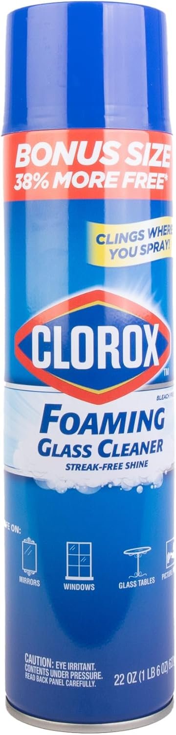 CLOROX GLASS CLEANER: The Clorox aerosol foaming glass cleaner is an easy way to keep mirrors, windows, glass tables, and picture frames clean streak free formula