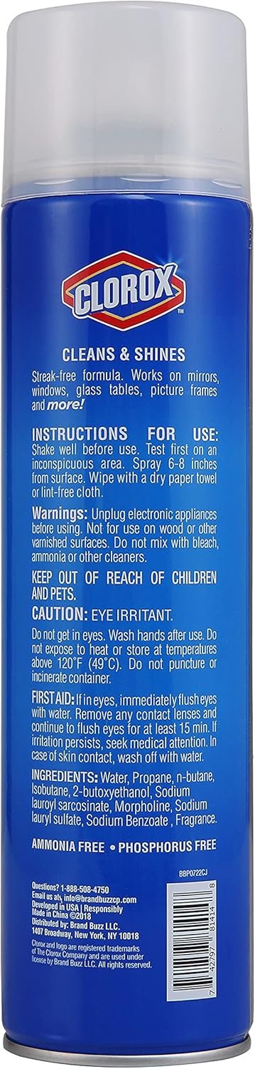 The Clorox Foaming Streak-Free Glass Cleaner is a quick, easy, and effective way to get your home into tip top shape. This glass cleaner delivers shiny windows with fewer streaks and better cleanliness than ever before. The formula of this glass cleaner clings to the areas you spray, meaning no dripping and no extra mess. Great for all types of glass, this versatile glass cleaner can be used to clean windows, tables, mirrors, and more. It is bleach-free, making this a glass cleaner you can use in your home and around your family. Not only will this cleaner for glass remove marks and stains from your glass, but it will also leave behind a beautiful shine without any streaks. Enjoy a cleaner home with Clorox. Directions Shake well before use. Test first on an inconspicuous area. To use, spray 6-8 inches from surface. Wipe with a dry paper towel or lint-free cloth. AMMONIA FREE PHOSPHORUS FREE. WARNINGS: unplug electronic appliances before using. Not for use on wood or other varnished surfaces. Do not mix with bleach ammonia or other cleaners Keep out of reach of children and pets. Do not get in eyes .Wash hands after use. Do not expose to heat or store at temperatures above 120 degrees F. Do not puncture or incinerate container.
