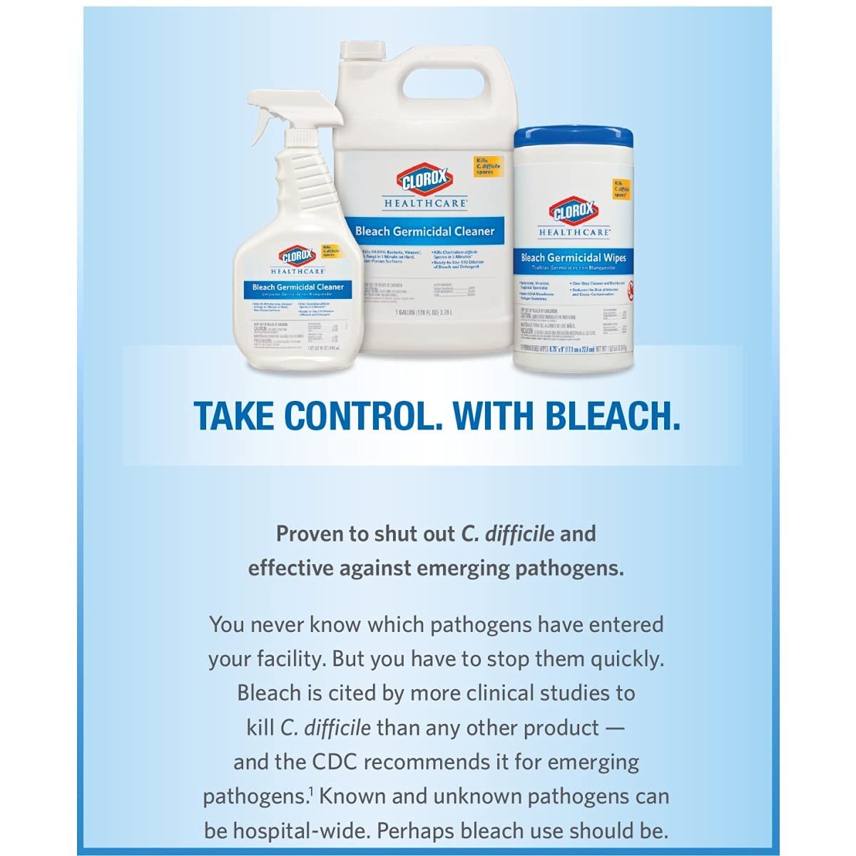 GERMICIDAL BLEACH: Clorox Healthcare Bleach Germicidal Cleaner is a ready to use one-step cleaner disinfectant; EPA registered to kill C.Difficile spores in 3 minutes and 49 other microorganisms in 1 minute