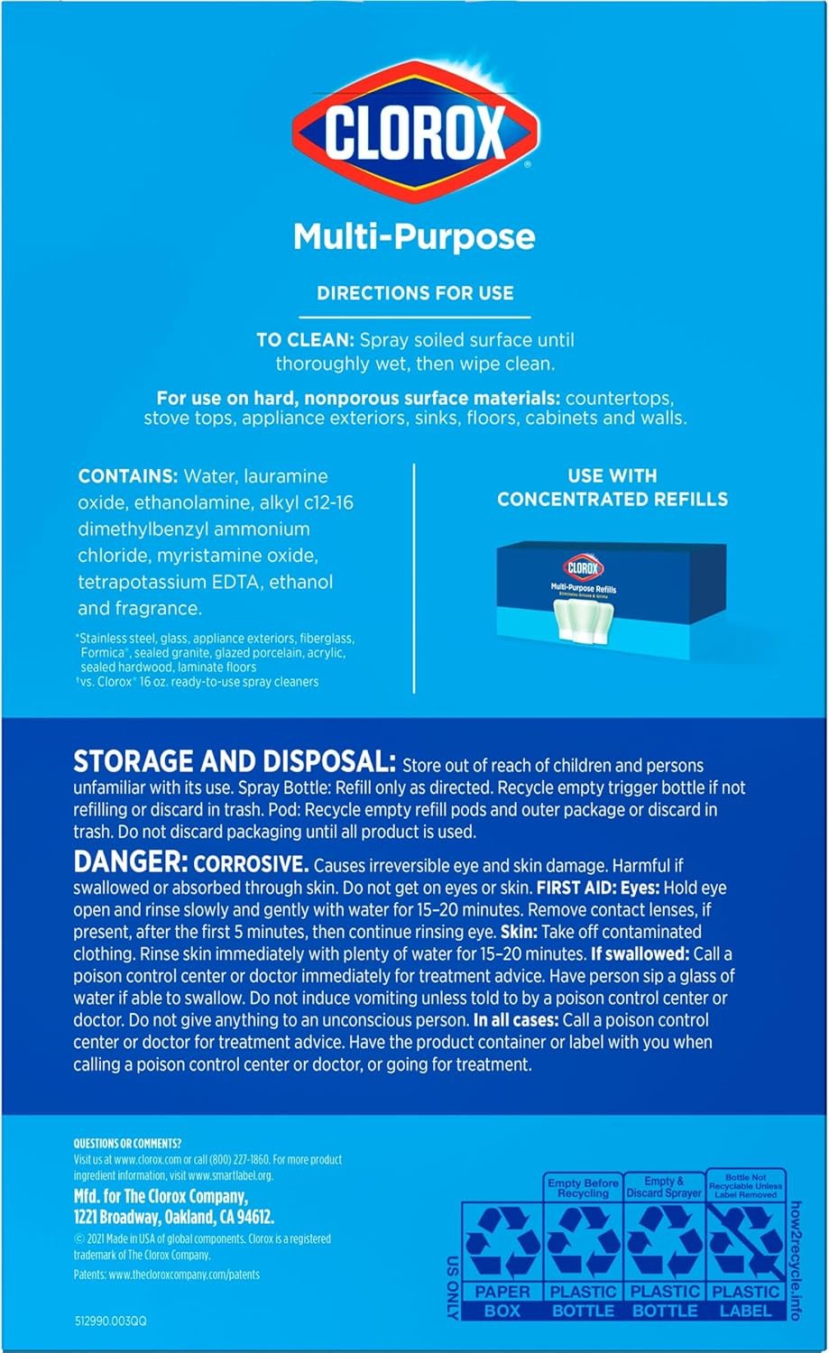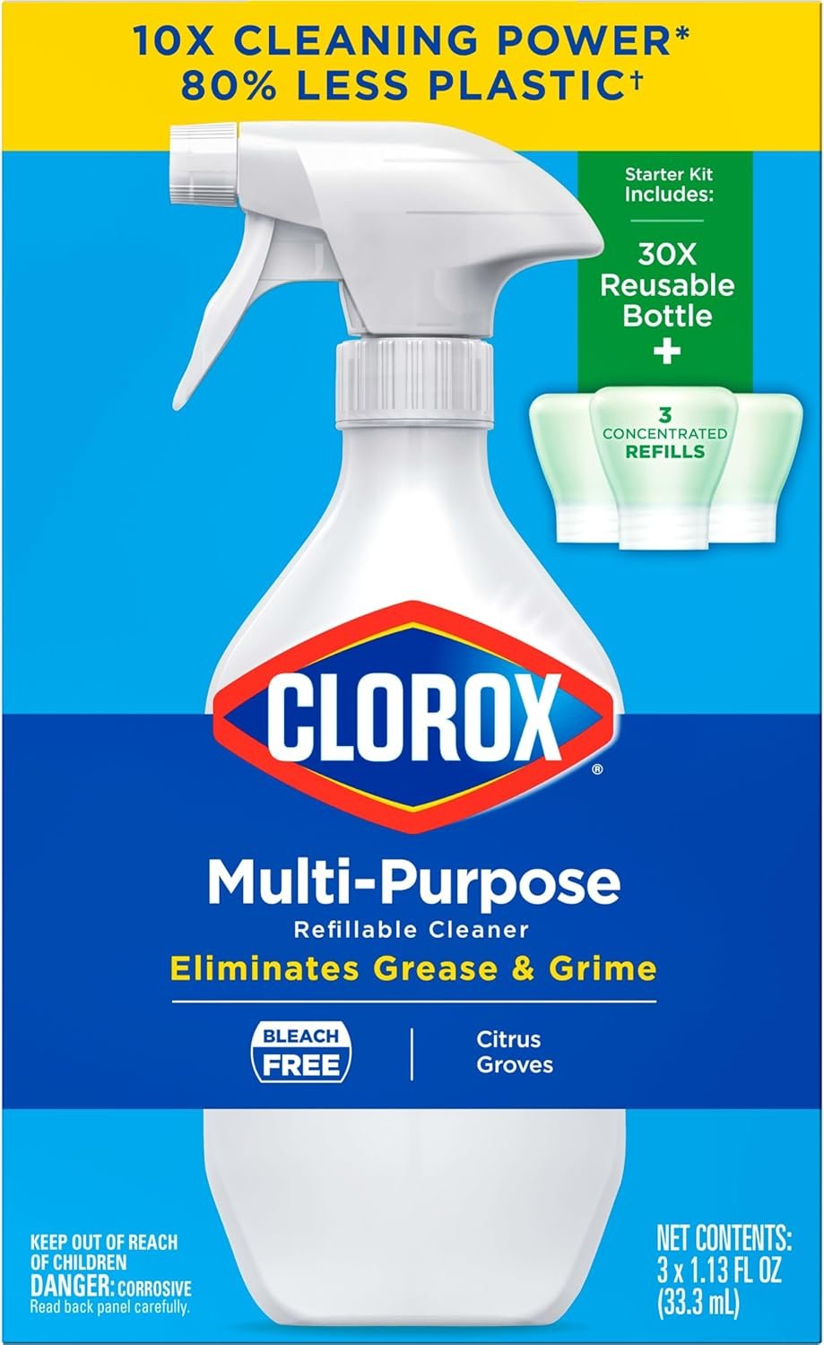 A more sustainable packaging alternative to traditional spray cleaners is here with the same Clorox cleaning power*. Clorox All-Purpose Cleaner removes tough stains around your house, leaving behind a delightful lemon scent to freshen your home. This bleach-free cleaner spray cuts through grease and grime on sealed granite, stainless steel and more. The all-purpose cleaner removes dirt, grease and grime safely from countertops, appliances, sinks and toilets. This cleaning system starter kit includes one spray bottle and one concentrated refill capsule. The refillable bottle is designed to withstand multiple uses and can be refilled at least 30 times. Save 80% less plastic** when switching to a Clorox Refillable Cleaners. By switching to this reusable system, you can help save the equivalent of 1 million plastic bottles***. *Vs. Clorox All-Purpose Cleaner. **80% less plastic by replacing thirty Clorox 16 fl oz spray bottles. ***Vs. non-refillable spray cleaners.