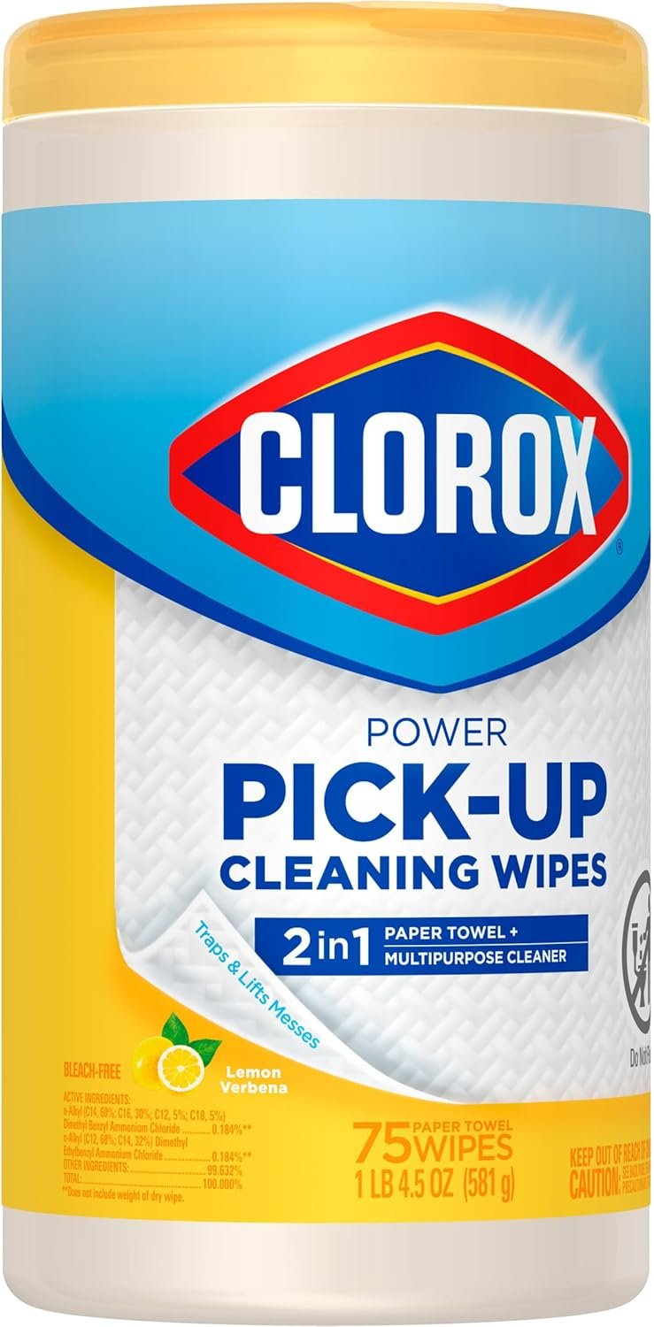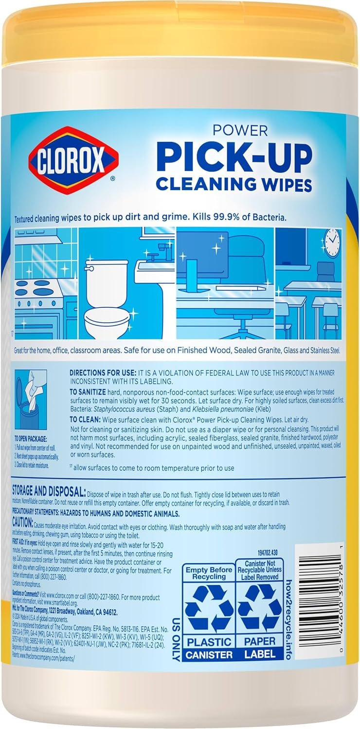 Clorox® Power Pick-Up Cleaning Wipes are your solution for quick mess pickup. These 2 in 1 wipes are a paper towel and multi surface cleaner together – they pick up dirt like a paper towel and sanitize like a wipe*, killing 99.9% of bacteria**. Patented technology picks up debris better than Clorox® Disinfecting Wipes, trapping dirt and grime for quick mess pickup and leaving behind a pleasant Lemon Verbena scent. This product is safe for use on multiple surfaces, including sealed wood, bathroom porcelain, stainless steel and most kitchen and household surfaces. Not recommended on unpainted wood and unfinished, unsealed, unpainted or waxed surfaces. *When used as directed on hard, nonporous surfaces. **Staphylococcus aureus (Staph) and Klebsiella pneumoniae (Kleb).