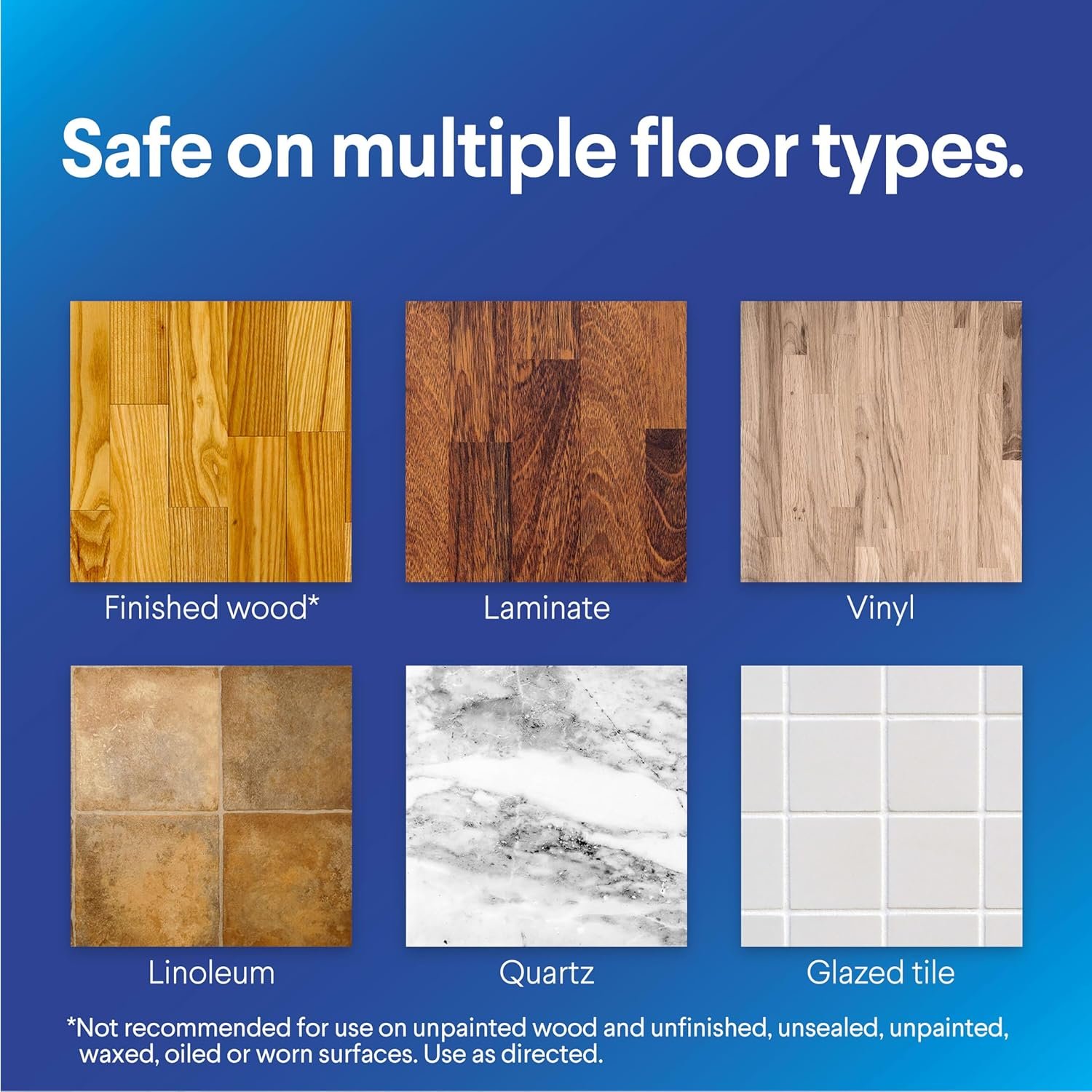 BLEACH FREE CLEAN: Bleach free formula cleans and disinfects a variety of hard, nonporous surfaces, including finished wood, laminate, vinyl, linoleum, quartz and glazed tile without harsh chemical smells
