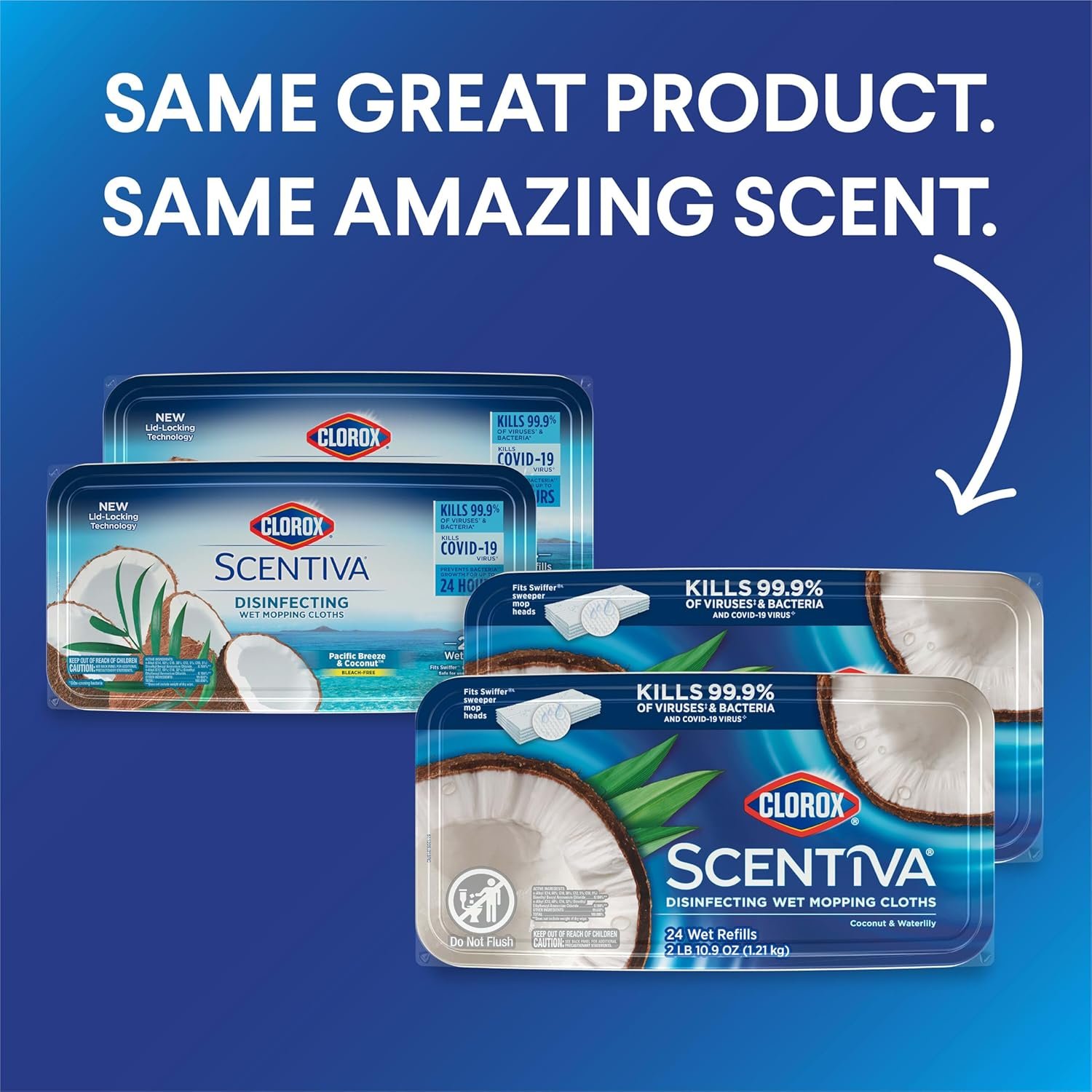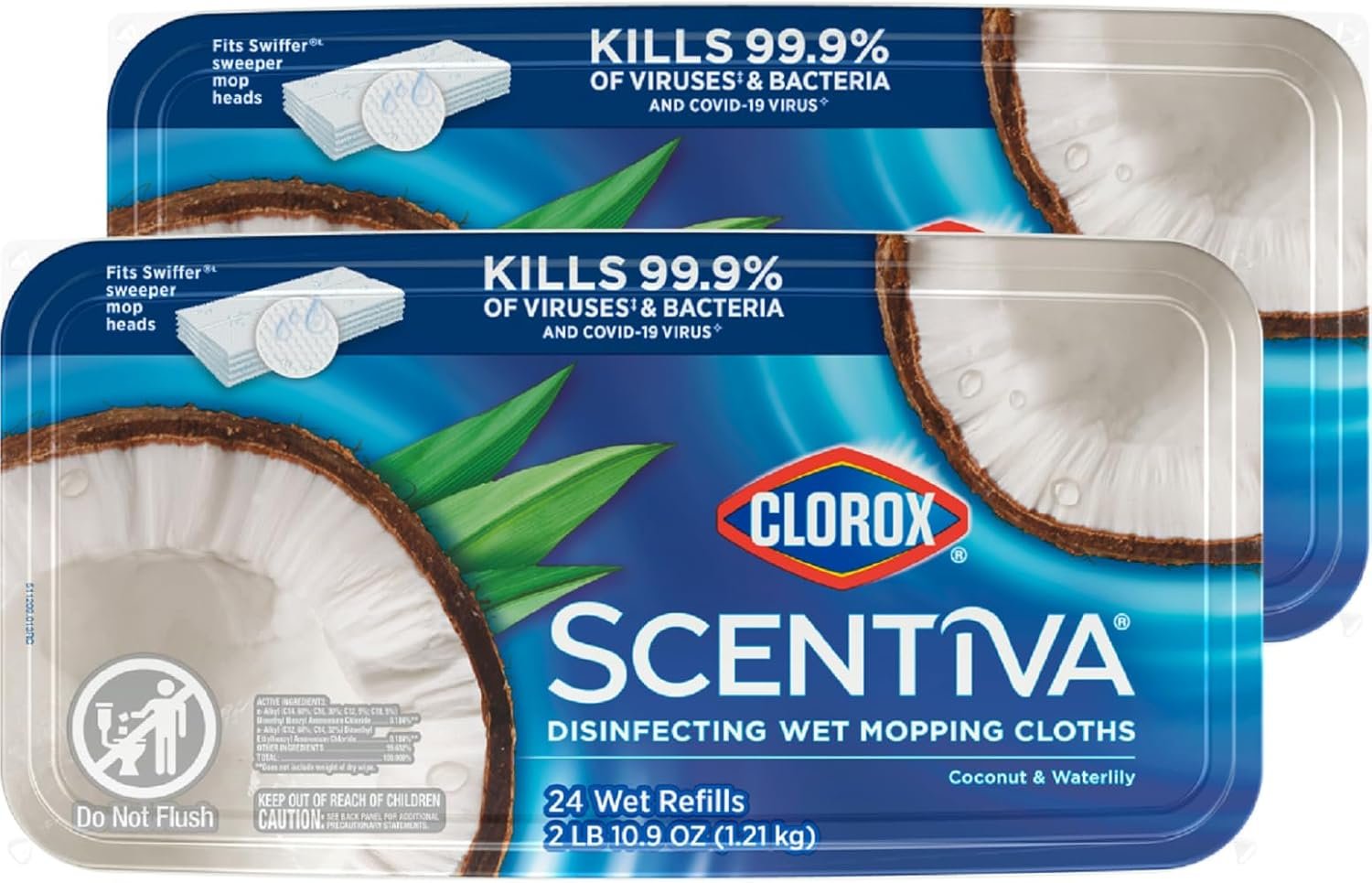 Clorox Scentiva Disinfecting Wet Mopping Cloths combine the trusted cleaning power of Clorox with the captivating scent of Coconut and Waterlily to transform your home. Clorox Scentiva scents are inviting blends that elevate your cleaning experience. Clorox Scentiva mopping cloths for floor cleaning eliminate 99.9% of viruses* and bacteria, including COVID-19** virus, while filling your home with long lasting scents. These Clorox mopping cloths are bleach free and prevent bacteria growth**** for 24 hours. Do not flush. *Pseudomonas aeruginosa, Salmonella enterica, Staphylococcus aureus, Escherichia coli O157:H7, Streptococcus pyogenes, Klebsiella pneumoniae, Influenza Virus Type A2, Influenza Virus Type B when used as directed on hard, nonporous surfaces. **Kills SARS-CoV-2 on hard, nonporous surfaces. ****Prevents odor causing bacteria on non food contact surfaces.