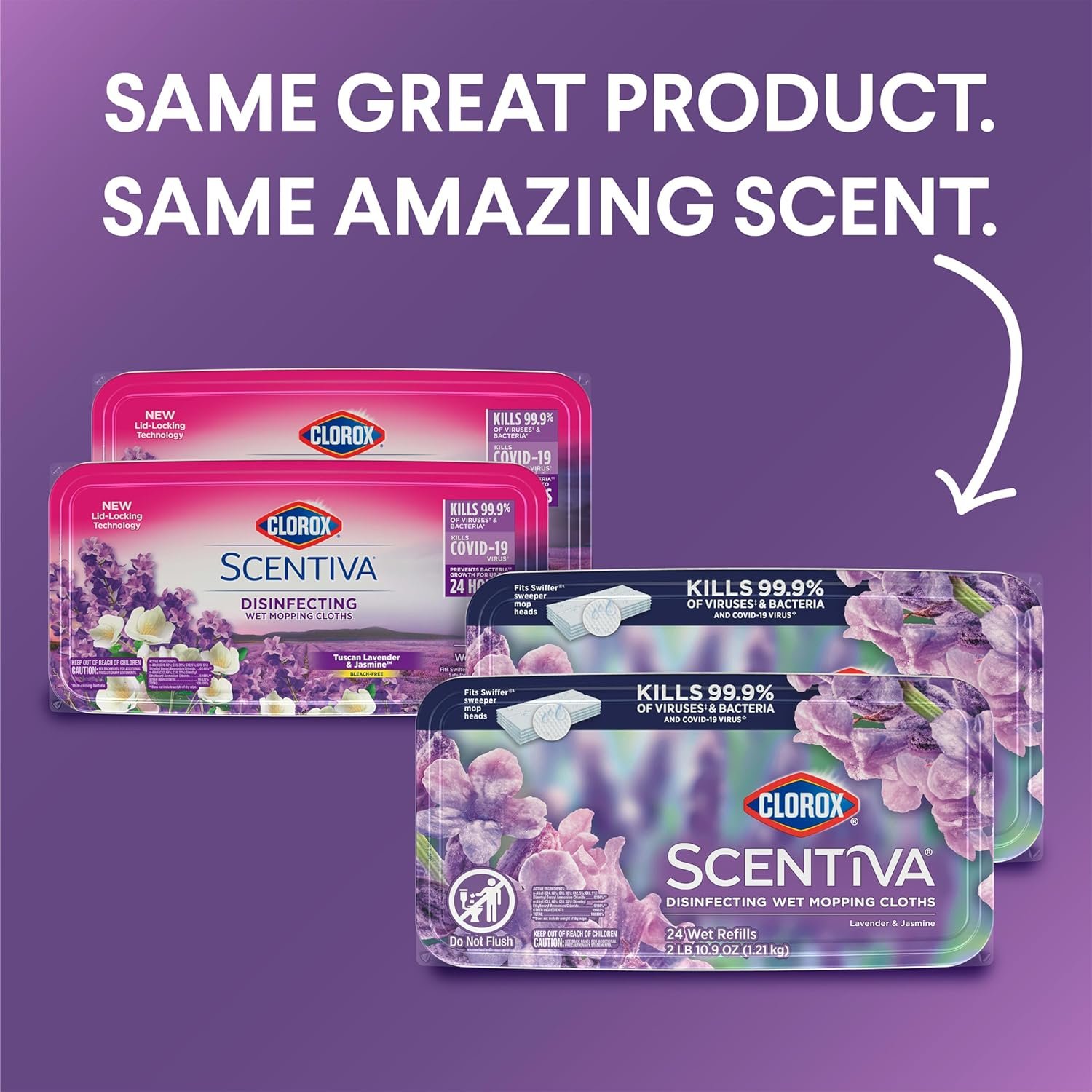 Clorox Scentiva Disinfecting Wet Mopping Cloths combine the trusted cleaning power of Clorox with the captivating scent of Lavender and Jasmine to transform your home. Clorox Scentiva scents are inviting blends that elevate your cleaning experience. Clorox Scentiva mopping cloths for floor cleaning eliminate 99.9% of viruses* and bacteria, including COVID-19** virus, while filling your home with long lasting scents. These Clorox wipes for mopping are bleach free and feature ultra textured fabric that traps 4X more particles, dirt and hair*** and prevent bacteria growth**** for 24 hours. *Pseudomonas aeruginosa, Salmonella enterica, Staphylococcus aureus, Escherichia coli O157:H7, Streptococcus pyogenes, Klebsiella pneumoniae, Influenza Virus Type A2, Influenza Virus Type B when used as directed on hard, nonporous surfaces. **Kills SARS-CoV-2 on hard, nonporous surfaces. ***vs Clorox Disinfecting wipes. ****Prevents odor causing bacteria on non food contact surfaces.