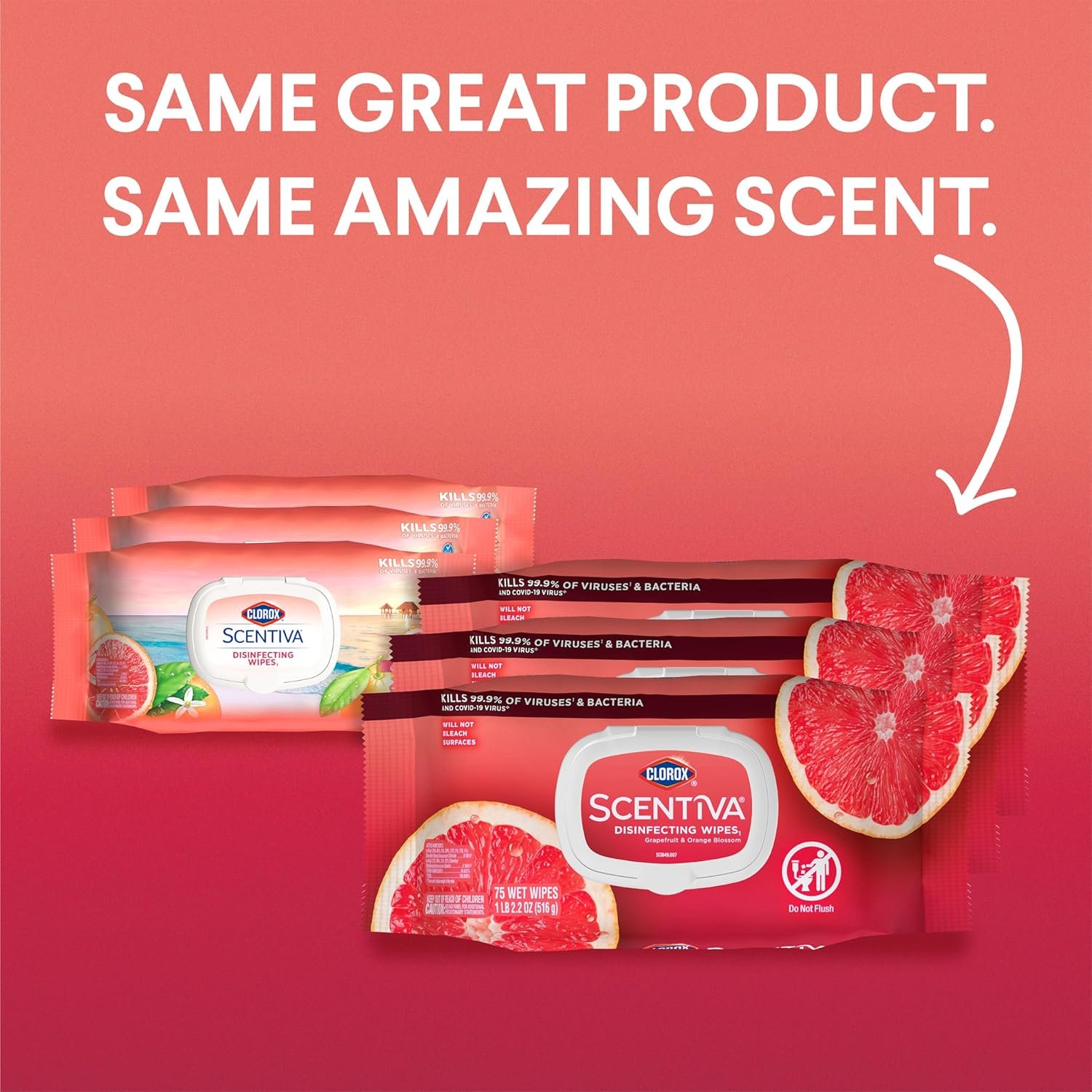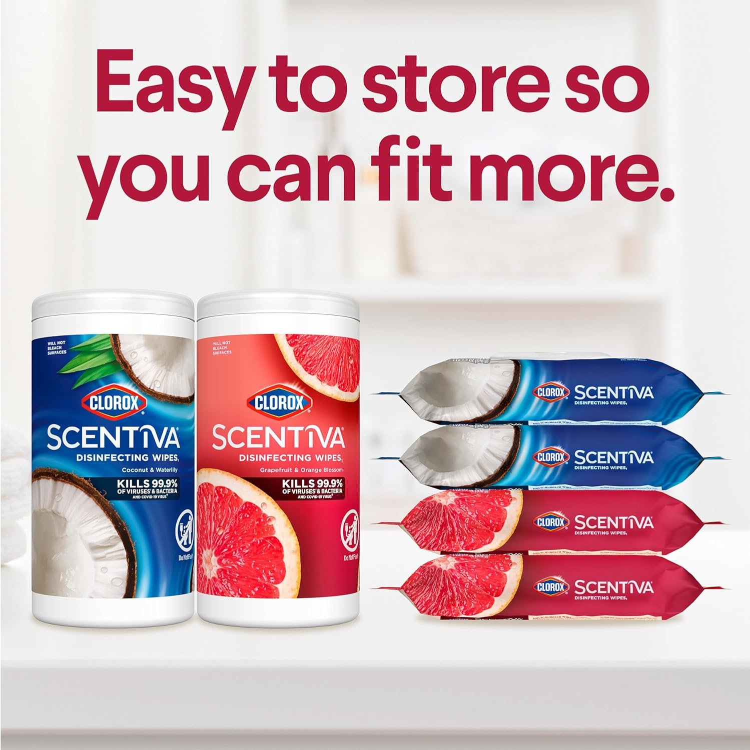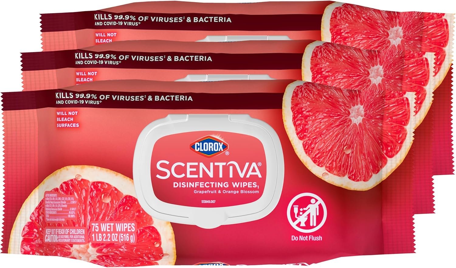 Clean and disinfect your home while enjoying the captivating, long-lasting scent of Grapefruit & Orange Blossom with these bleach-free , all-in-one cleaning wipes. Clorox Scentiva Disinfecting Wipes kill 99.9% of viruses and bacteria, including the COVID-19* Virus, in 15 seconds with the power of Clorox clean. These multi-surface cleaning wipes feature a clear-drying formula that powers through grease, soap scum and grime, so you can tackle any surface with confidence. Clorox Scentiva Disinfecting Wipes even prevent bacteria growth* for up to 24 hours. Germs and messes occur on more than kitchen counters and bathroom surfaces. Safely wipe down garbage cans, sinks, toys, remotes and appliances, or clean up car spills with these non-bleach sanitizing wipes. Do not flush. *Kills SARS-CoV-2 on hard, non-porous surfaces. Use as directed for other germs. Prevents growth of odor-causing bacteria on non-food contact surfaces.