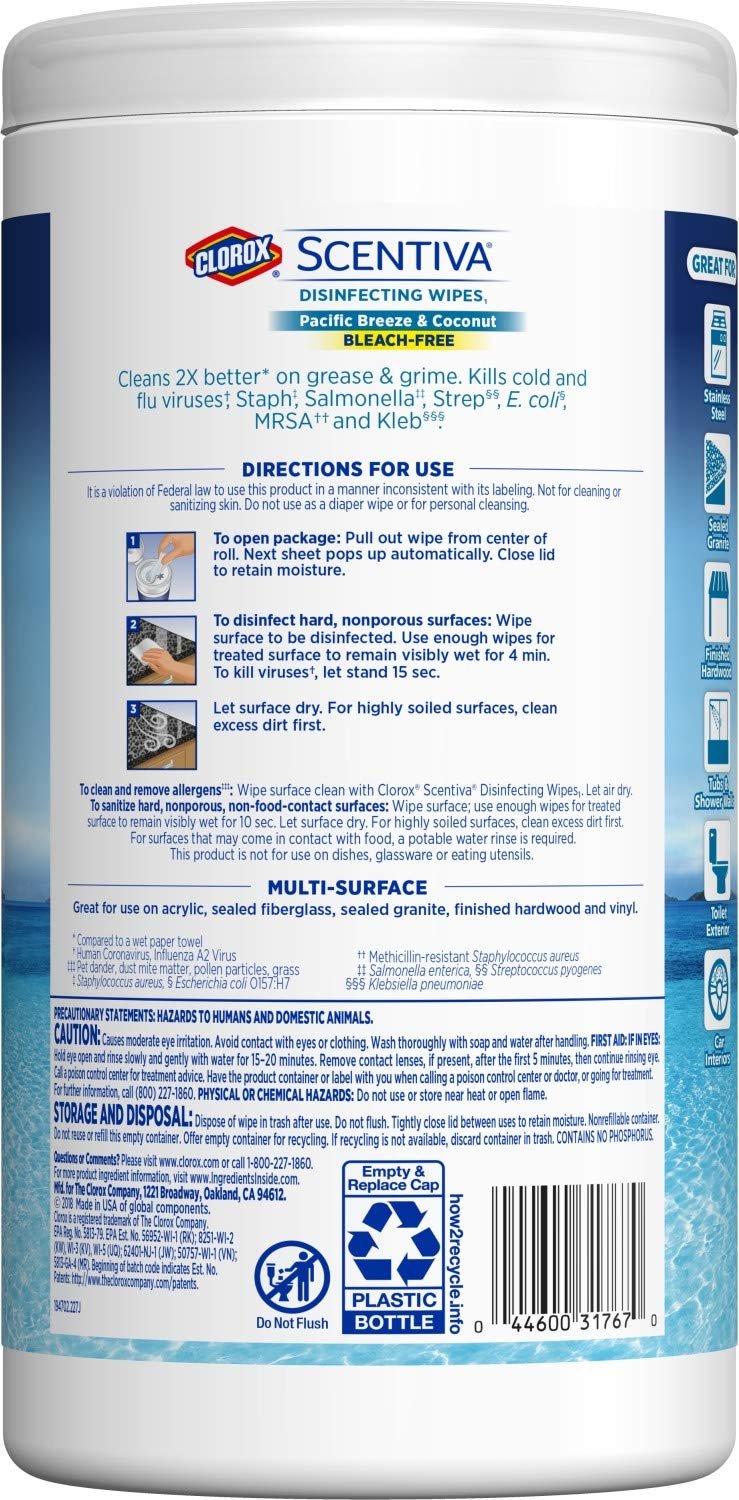 Clorox Scentiva Disinfecting Wipes combine the trusted cleaning and disinfection power of Clorox with the captivating scent of Pacific breeze & coconut to transform your entire home. Clorox Scentiva scents are well-crafted, curated, inviting blends that will elevate your cleaning experience. These cleaning wipes are bleach-free and multi-purpose and powers through tough grease and grime with ease. Use these Disinfecting Wipes for garbage cans, kitchen countertops, sinks, bathroom surfaces, appliances, and car interiors. Utilize these Multi-Surface wipes to cut down on your necessary cleaning supplies and quickly wipe away an array of messes. Safe to use on most surfaces and around pet areas, Clorox Scentiva Disinfecting Wipes eliminate 99.9% of germs while filling your home with uplifting, long-lasting scents.