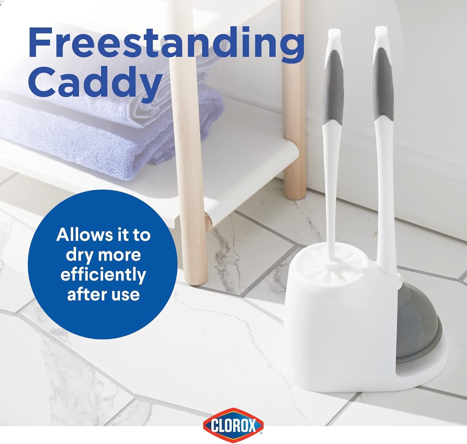 The Clorox Toilet Bowl Brush and Plunger Set is a must-have for a clean and hygienic bathroom, whether it’s your main bathroom, guest bathroom, or business restroom. This 2-in-1 cleaning set features a discreet yet functional toilet cleaning caddy that stores both the toilet brush and plunger in a compact, space-saving design. The caddy helps keep your bathroom clean and sanitary by catching drips and allowing moisture to evaporate quickly, preventing odors and bacteria buildup. The toilet brush is equipped with durable bristles that provide a deep, thorough clean in hard-to-reach places, including under the rim and deep into the bowl, ensuring every part of the toilet is spotless. Designed for long-term use, the toilet brush offers a tough, efficient clean without wearing out. The high-efficiency toilet plunger is constructed from premium materials, featuring a flange cup that helps clear even the toughest clogs efficiently and quickly. Ideal for all types of toilets, this plunger is an essential tool for bathroom maintenance. Both the brush and plunger have long, ergonomic handles for a comfortable grip during extended cleaning sessions, helping keep your hands dry and clean. The vertical caddy design ensures easy access while keeping your cleaning tools organized and out of sight. This simple yet stable set is perfect for any bathroom, including those in homes, dorms, apartments, businesses, RVs, and boats—anywhere toilet maintenance is needed.