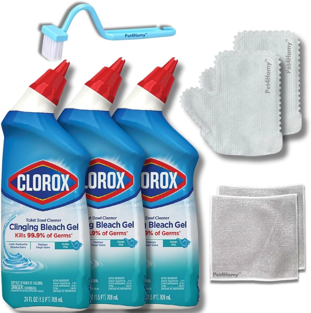 Bundle Includes 4 Items: This bundle contains Clorox Toilet Bowl Cleaner, Clinging Bleach Gel, Ocean Mist – 24 oz, Pack of 3, Pet4Homy branded cleaning gloves, a heavy-duty cleaning brush, and a pair of multipurpose wire miracle cleaning cloths.