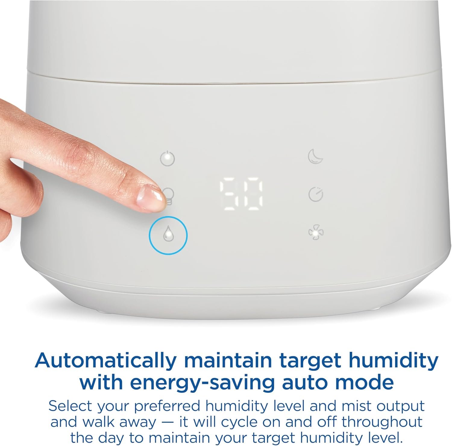 AUTOMATICALLY MAINTAIN TARGET HUMIDITY WITH AUTO MODE: This air humidifier lets you keep your humidity at your target level. Select your preferred humidity, set the mist output and walk away — it will cycle on and off to maintain your target level.