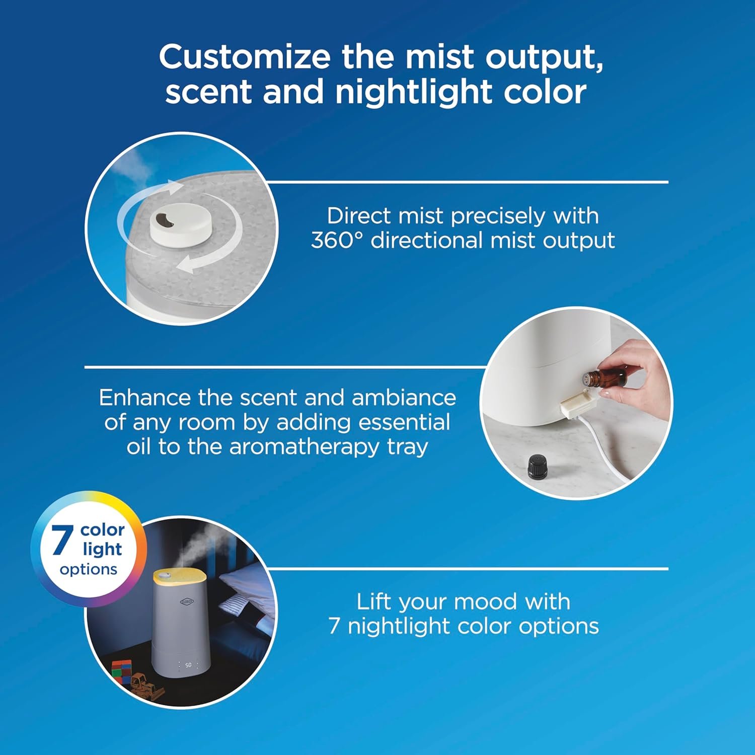 ADJUST THE MIST OUTPUT TO MATCH YOUR NEEDS: Enjoy up to 40 hours of continuous humidification on the lowest mist setting or quickly humidify dry air with the medium or high setting. The powerful mist output lets you quickly raise the humidity in any room.