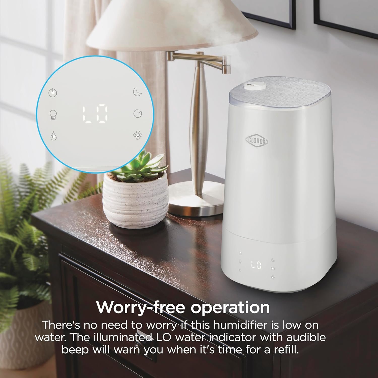 STAYS CLEANER LONGER WITH GERM-REDUCING TECHNOLOGY*: This room humidifier requires less cleaning than traditional humidifiers. The UV LED light in its base helps reduce growth of bacteria and mold in the water and on the surfaces of the water tray.