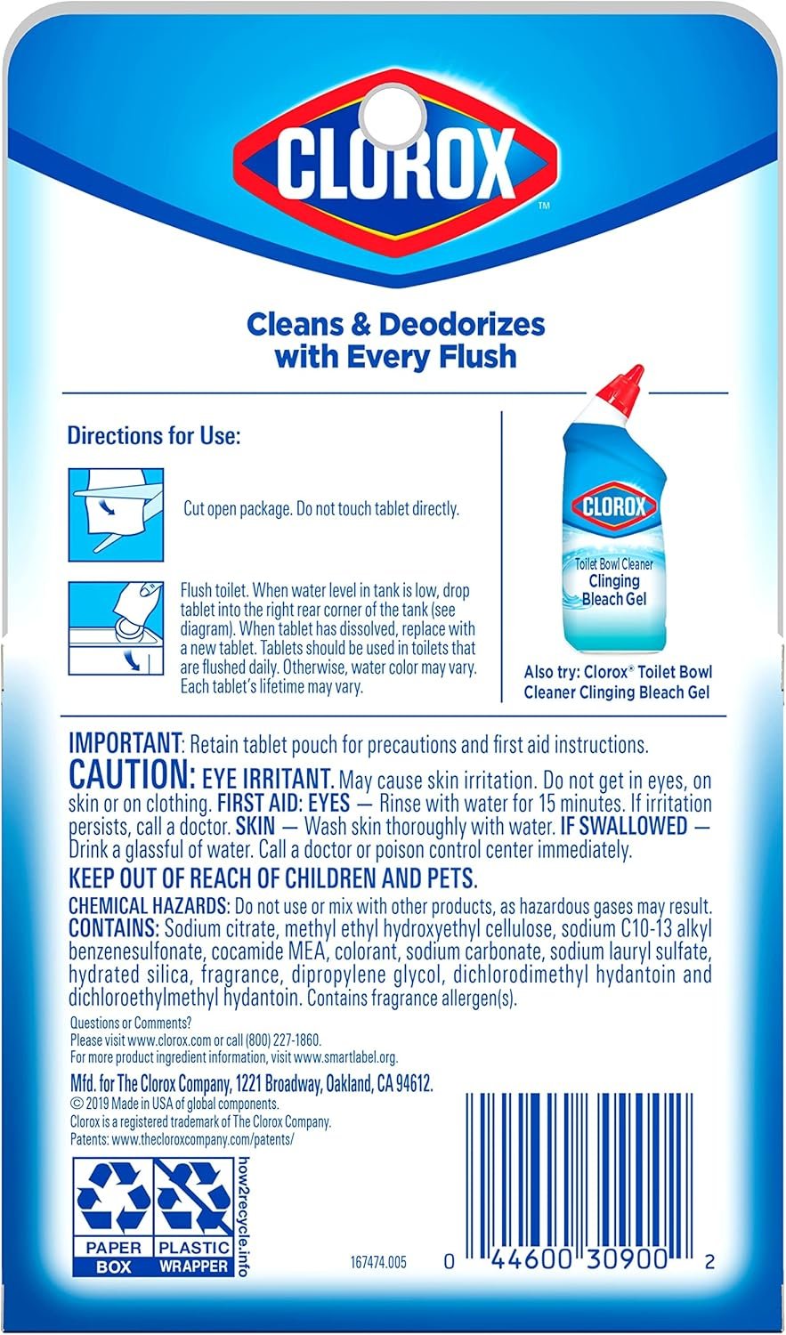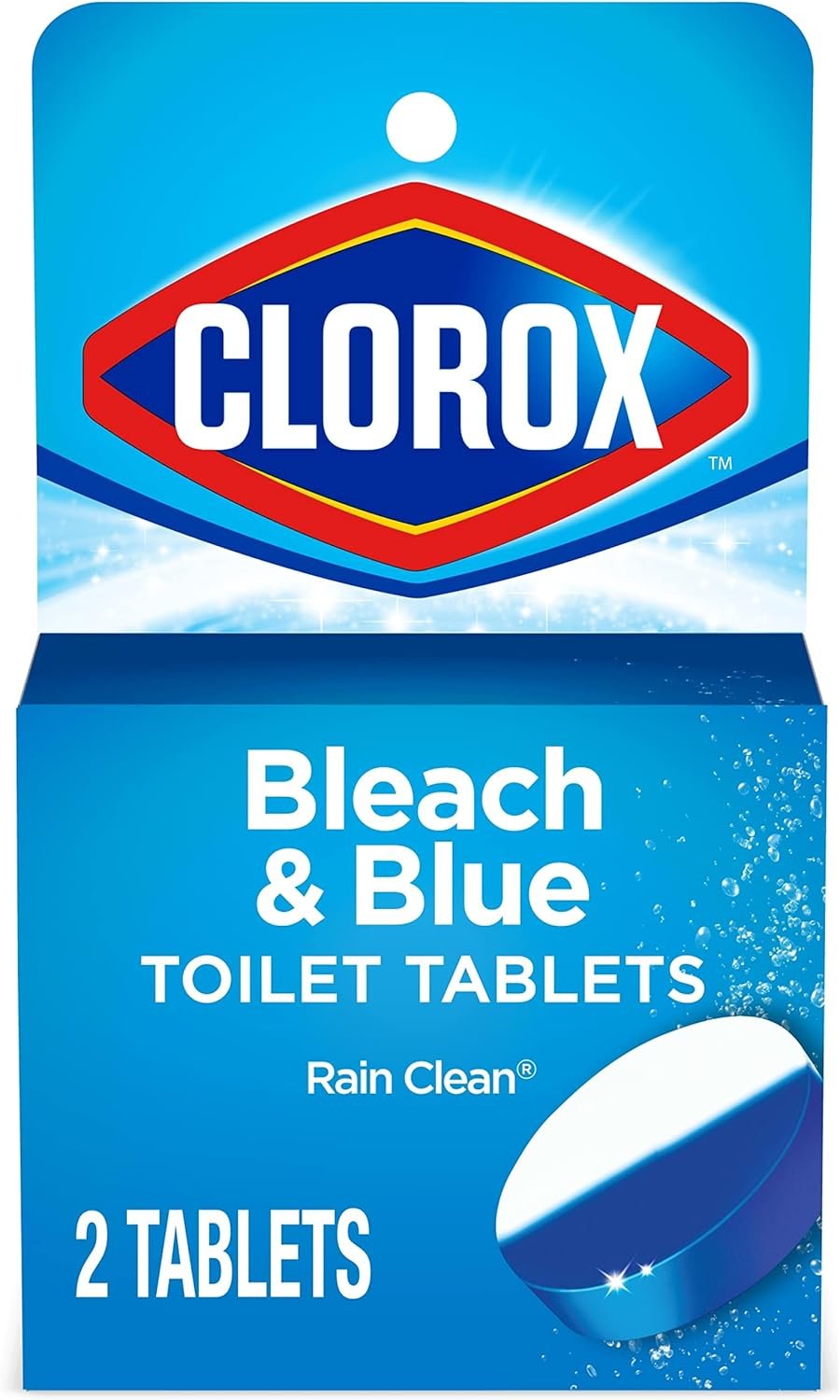 Clorox Ultra Clean Toilet Tablets Bleach & Blue cleans and deodorizes your toilet bowl with every flush and leaves a fresh Rain Clean Scent. These toilet bowl cleaning tablets continuously cleans, prevents stains and deodorizes, eliminating the need to scrub every time. Each tablet leaves the toilet bowl sanitary in 5 minutes, and delivers a long-lasting Bleach & Blue clean that is good for up to 4 months. And, with this 2-pack, you can keep your toilet clean and the dreaded toilet ring away for up to 8 months, and help extend the time between deep cleans. Simply drop a tablet into your toilet tank and watch it do its thing. When the blue water fades, it is time to drop in another tablet. Keep your toilet bowl sparkling fresh and ultra clean with no mess and no fuss with the help of Clorox Ultra Clean Toilet Tablets Bleach & Blue.