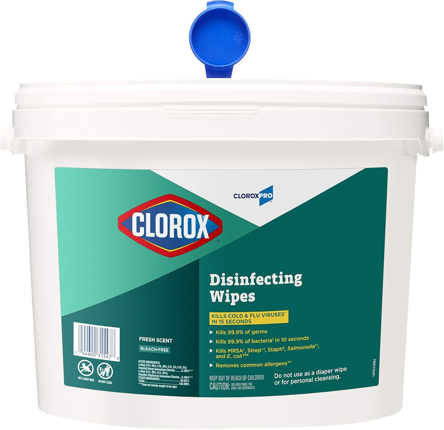 Behind every smooth-running working environment, there are Clorox Disinfecting Wipes. CloroxPro Clorox Disinfecting Wipes are EPA registered to kill 99.9% of germs on surfaces including 10 second sanitization claims against bacteria three times faster than before. They are EPA registered to disinfect surfaces from a variety of microorganisms including the cold and flu viruses, MRSA, Staph, E. coli, Strep, Salmonella, and the organism that can cause whooping cough. In addition, these wipes meet EPA criteria for use against SARS-CoV-2, the virus that causes COVID-19, on non-porous surfaces. They remove common allergens including pet dander, pollen particles and grass. Clorox Disinfecting Wipes are a quick and easy way to clean and disinfect high-touch germ hot spots such as doorknobs, handrails, faucets, and a variety of other hard, non-porous surfaces. They can also be use on phones, keyboards and mice. This starter kit includes an economical bucket with a refill pack of 700 wipes, so you can be sure that all high traffic areas stay clean. Clorox Disinfecting Wipes from CloroxPro are an essential tool for any office, day care center, school, restaurant, and any other commercial facilities to stock. Packaging may vary.