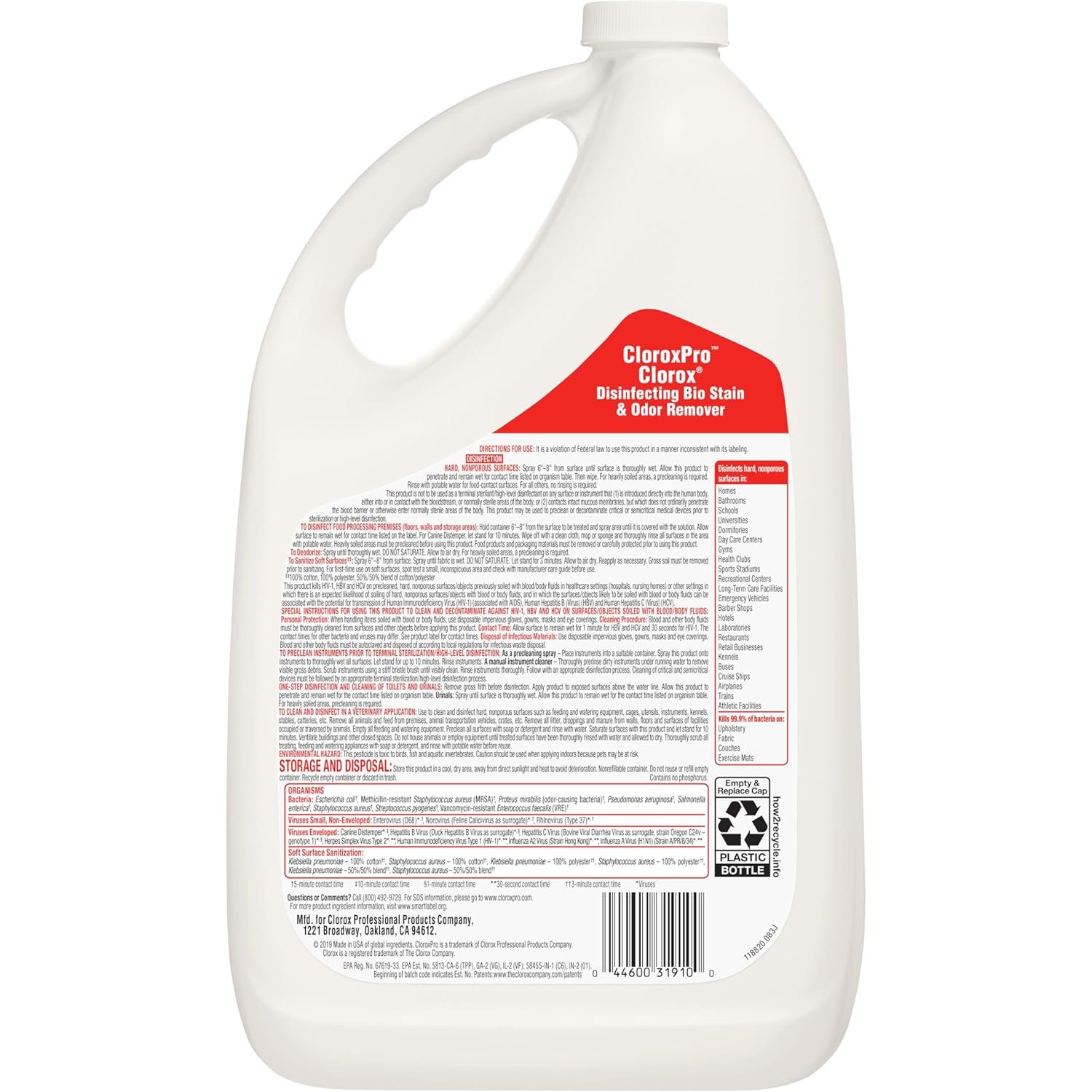 DISINFECTING SPRAY REFILL: Clean and disinfect with CloroxPro Disinfecting Bio Stain & Odor Remover; kills Norovirus, E. coli, Salmonella and Staphylococcus aureus (Staph); packaging may vary