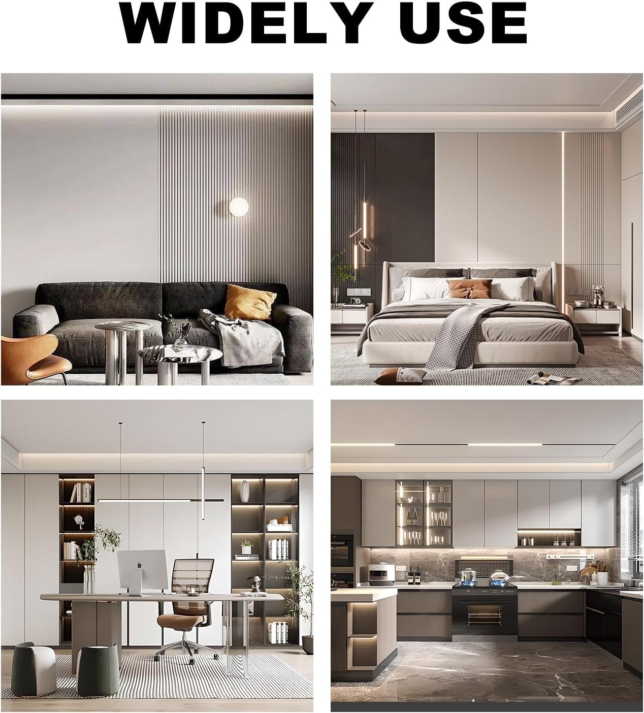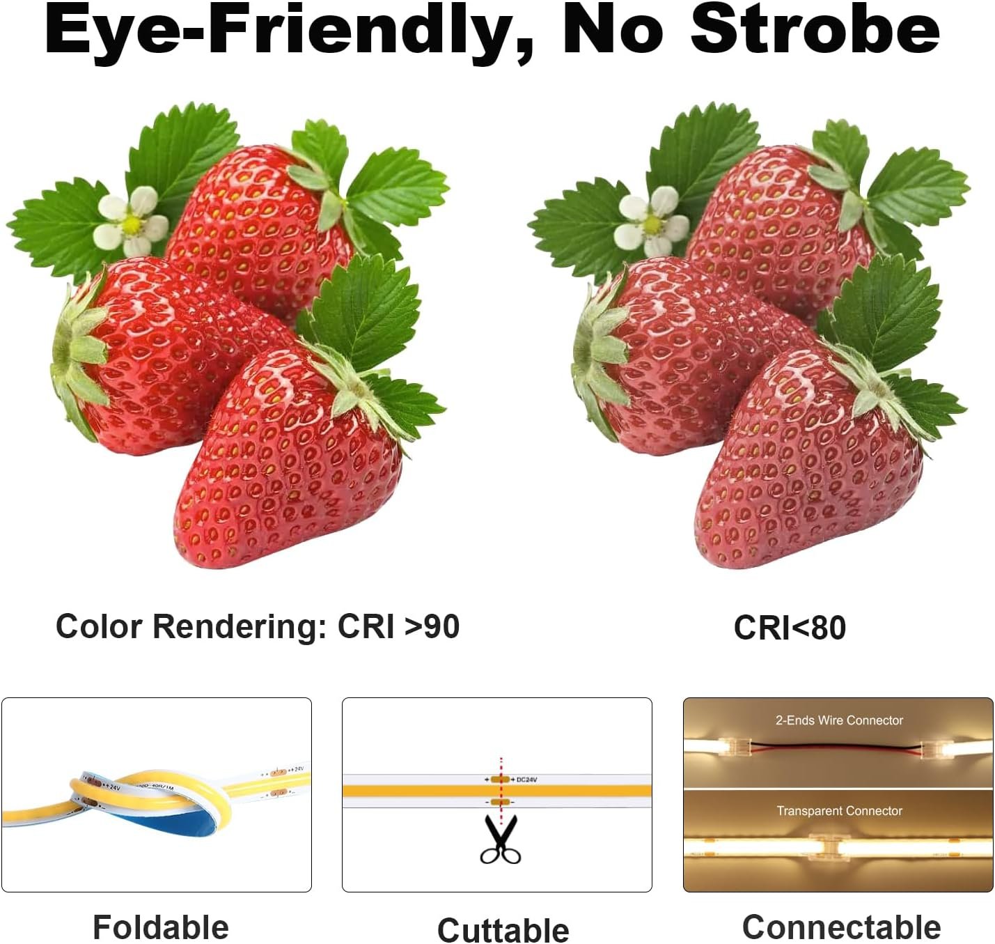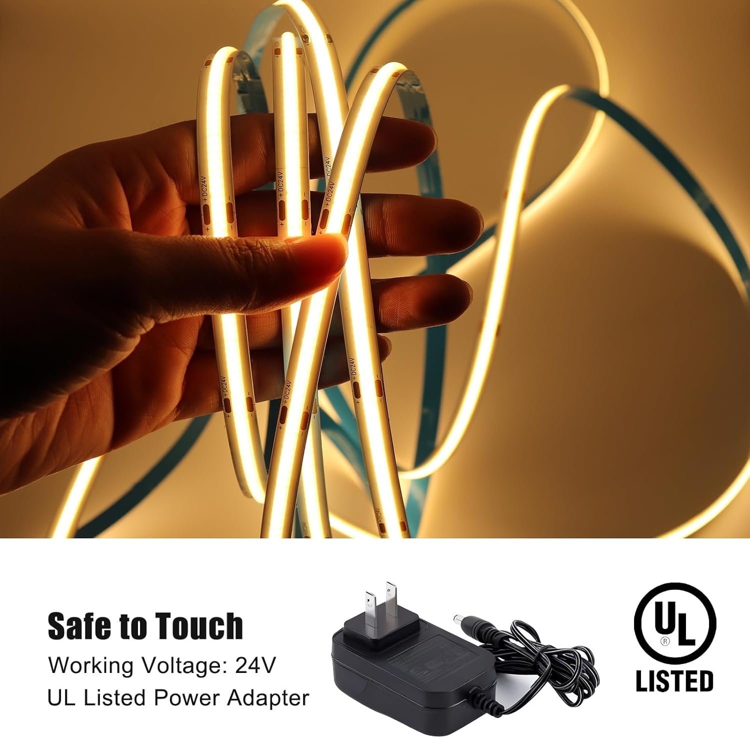 This COB LED light strip is safe to touch with no dark zone lightingCan be used for the underside of a bar top, living room, bedroom, kitchen, makeup mirror, display case, stairs, TV back, tools room, garage, home theater for mood lighting.