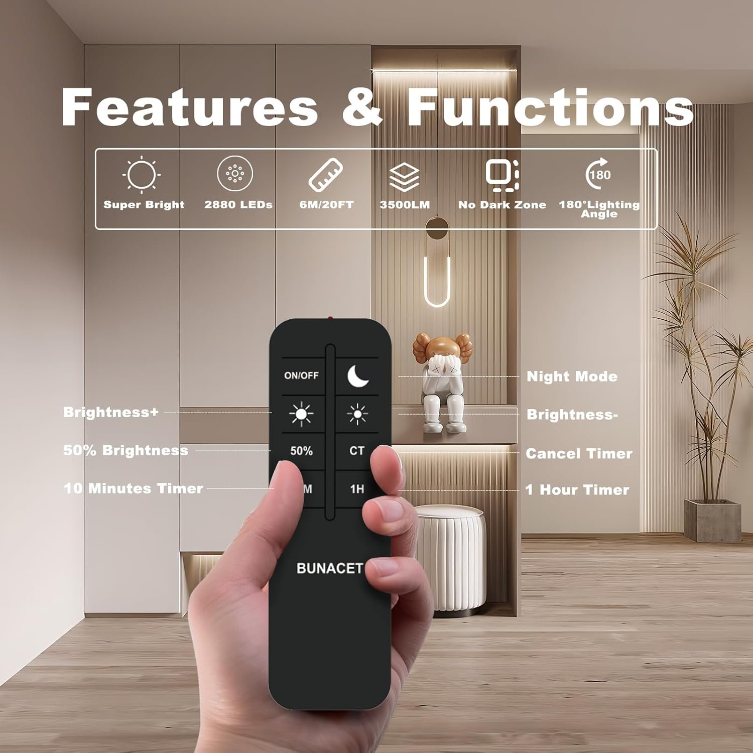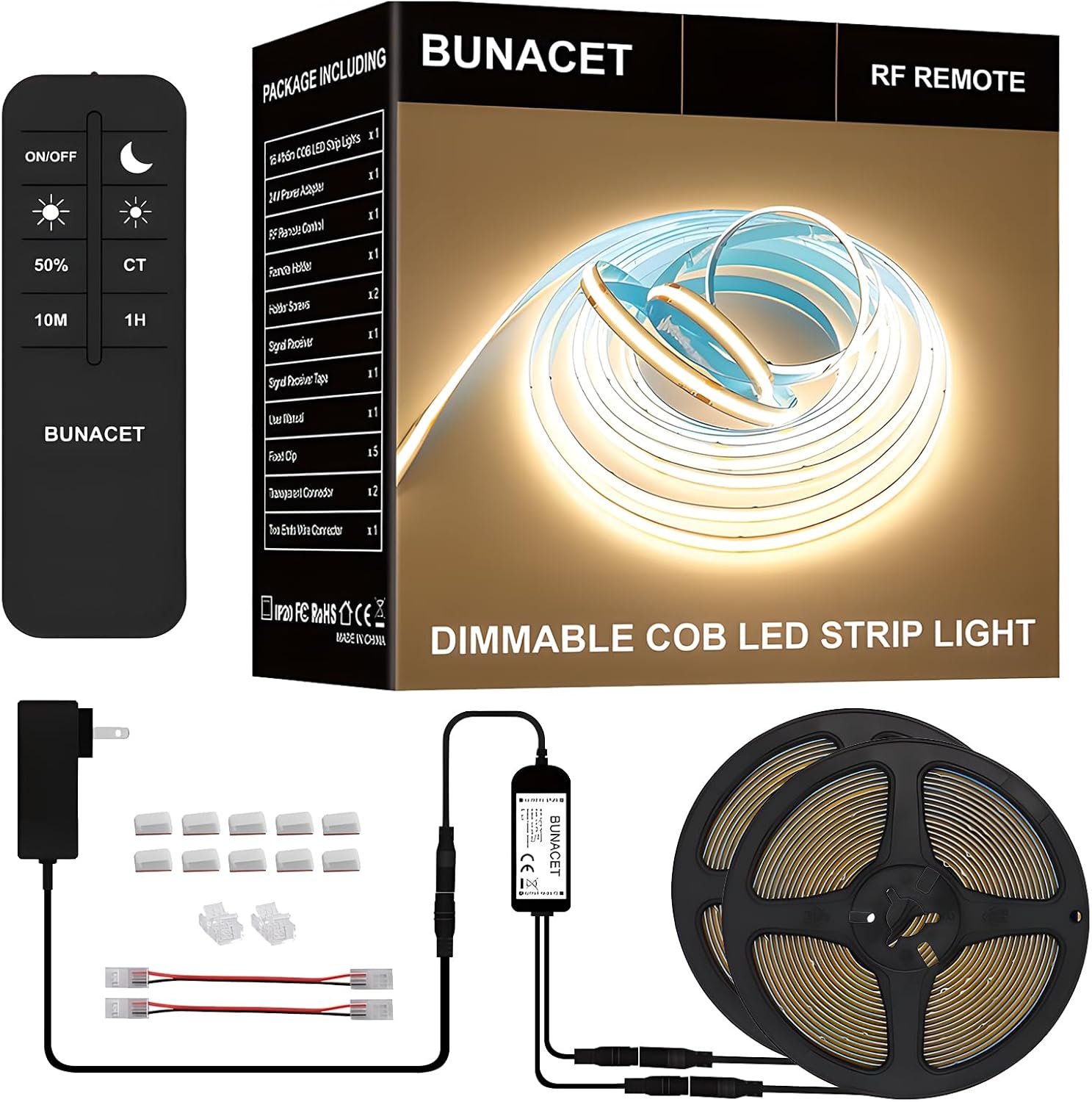 White COB LED strip light with RF remote, 360 degree all-round controllable, the RF remote control distance up to 49ft – 66ft (15-20 meters), perfect to make up for the shortcomings of IR remote control. Dimmable LED strip lights with night mode, timing and memory function, it will remember the state when it was last turned off, and the mode and brightness will be the same as the last one when it is turned on again.
