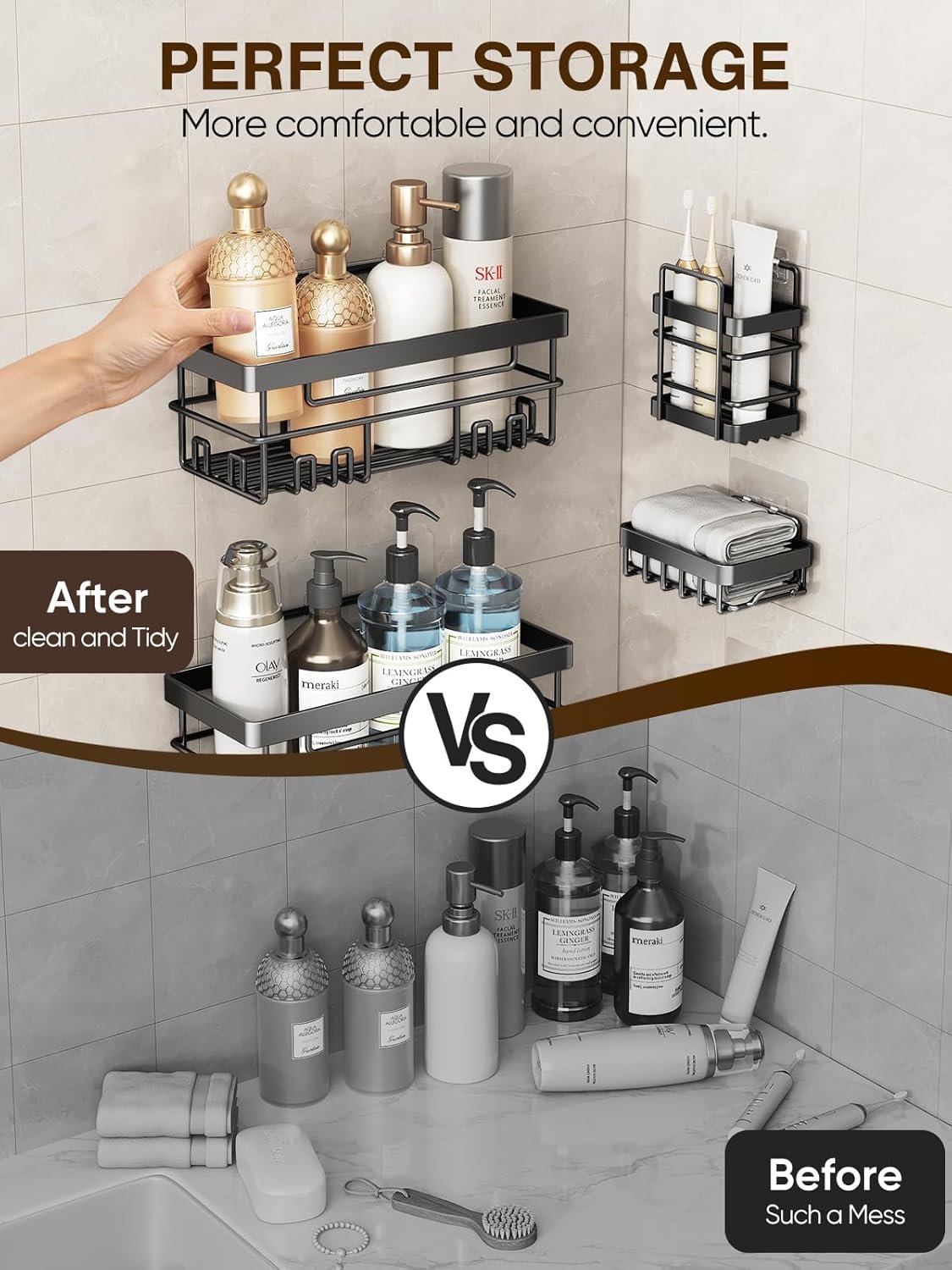 5 hanging shower racks for ample storage in the bathroom & kitchen: Bathroom storage racks have 5 different uses, including large and small shower racks, as well as soap and toothbrush holders and 5 adhesives. Large capacity, can easily accommodate washing supplies or cooking seasonings, make full use of space, convenient for your life.