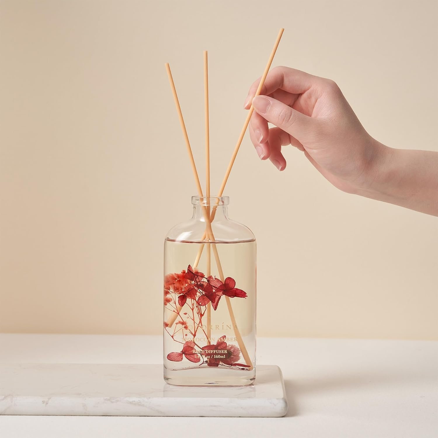Inclusive of: One glass bottle containing fragrance diffuser (5.41 fl oz), infused with a blend of essential oils and fragrance, accompanied with 6 pure cotton sticks. Adjust the fragrance intensity by manipulating the number of sticks.
