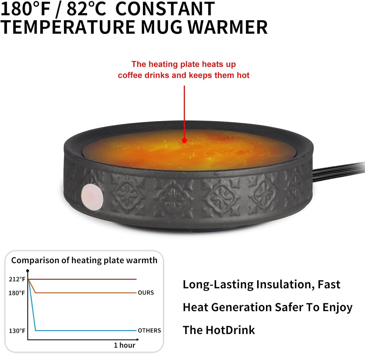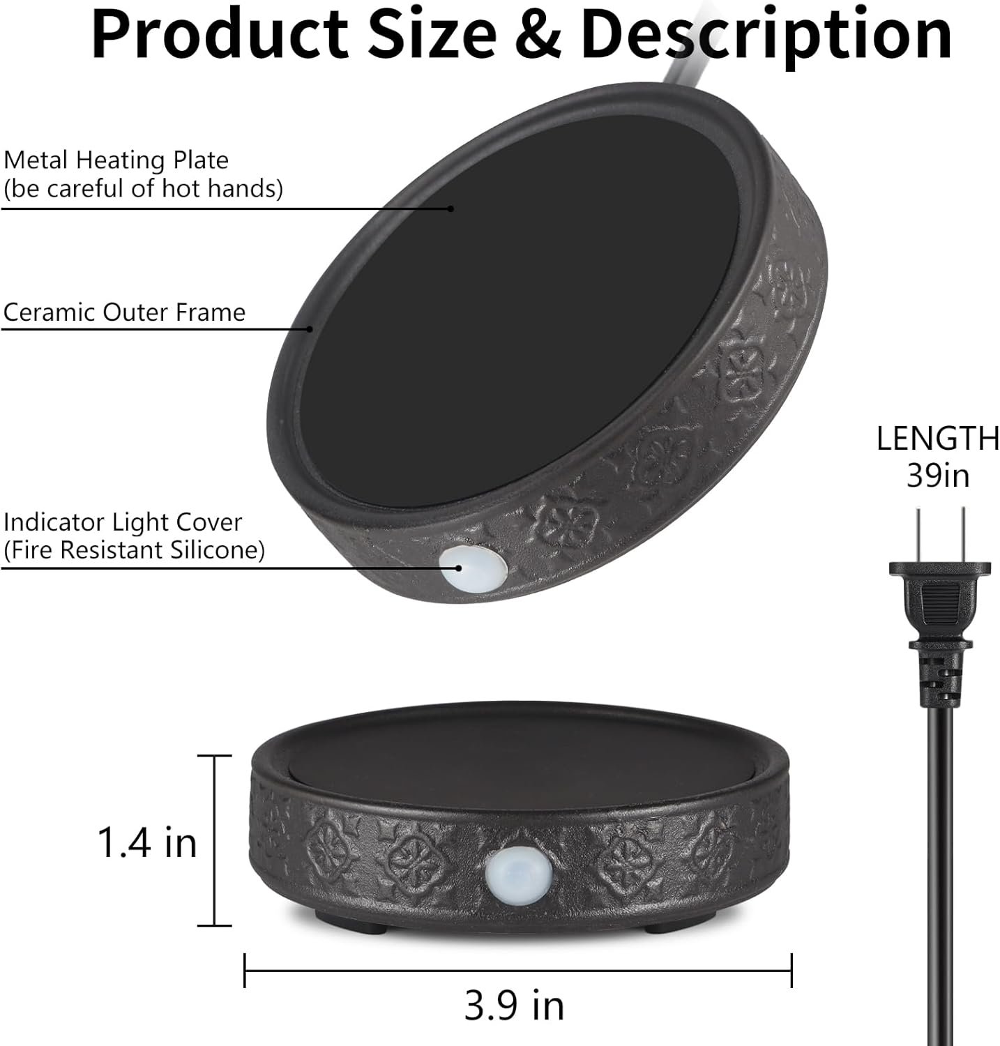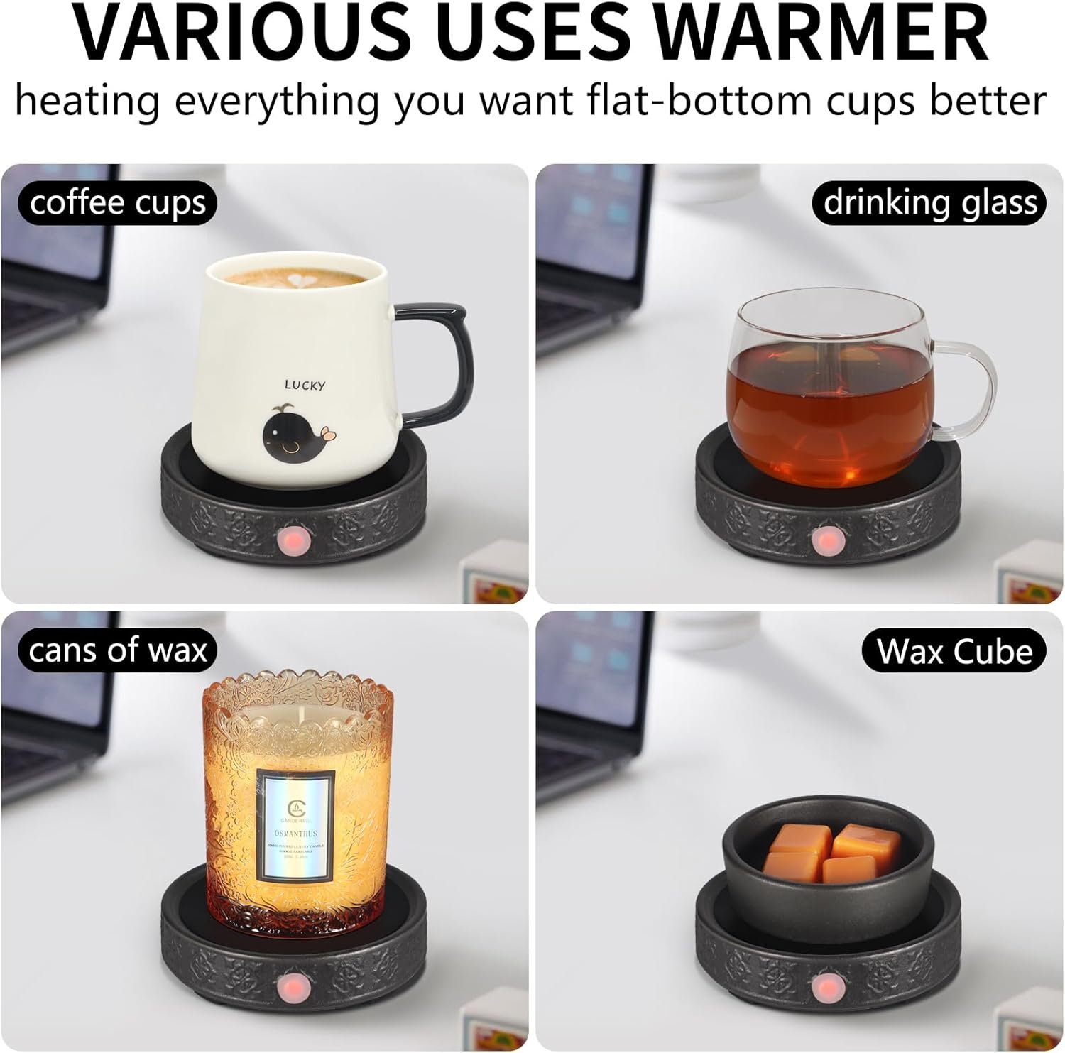 【Multi-Functional Warmer】:electric cup warmer for office Desk can fit most flat-bottomed cups, such as ceramic cup, glass cup, stainless steel cup etc. It can also be used as a Candle Jar warmer plate to warm up your scent candles to fill your room with fragrance.