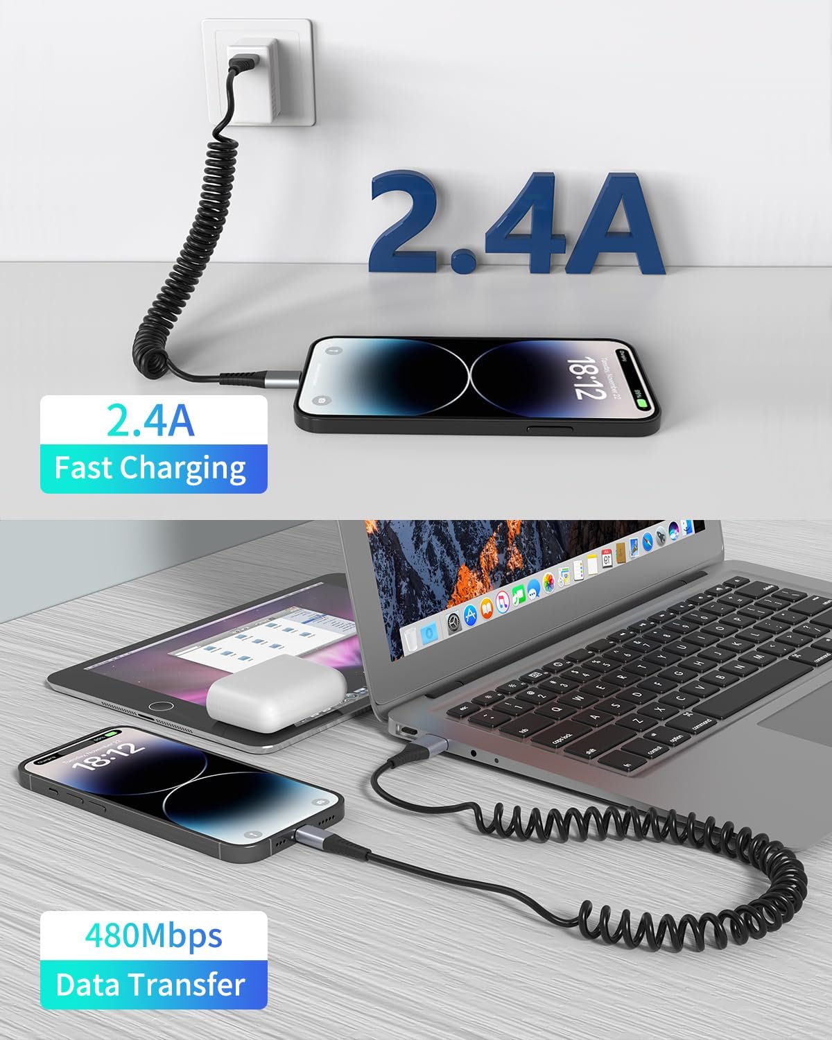 Compact Design: Retractable and flexible coiled lightning cable takes up minimal space and is easy to carry.