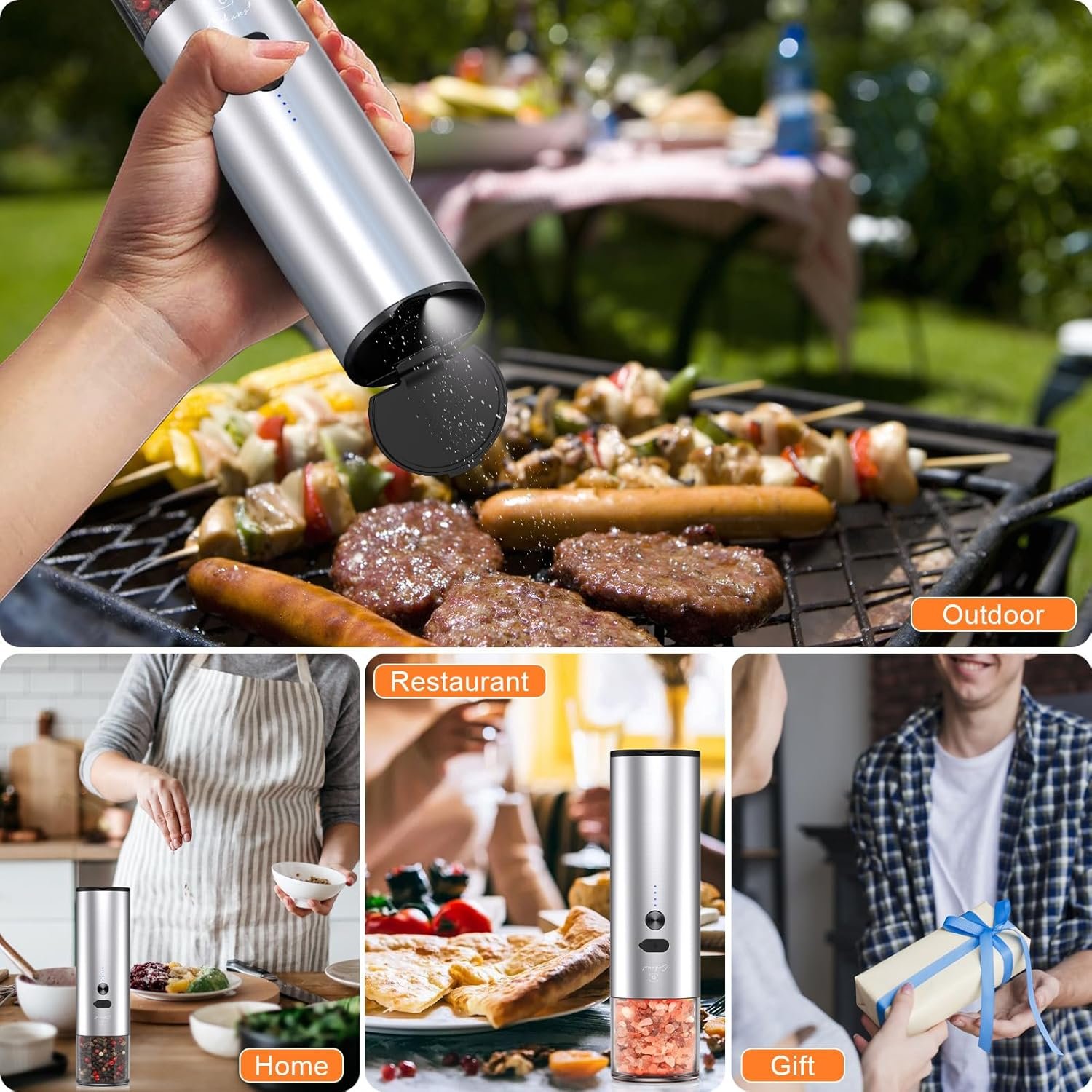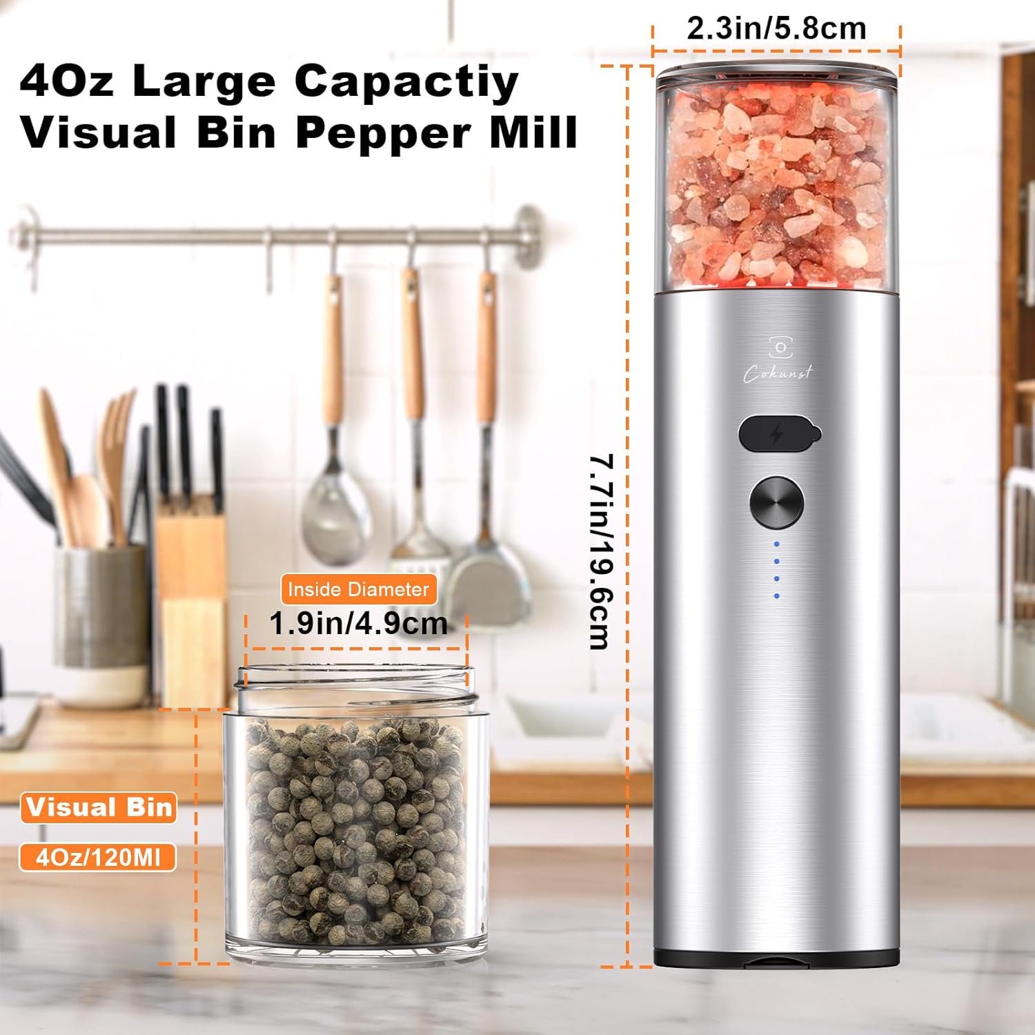【Large Capacity Visual Silo】The electric salt and pepper grinder is equipped with a 4 Oz/120 Ml large-capacity visual bin, so you can clearly see the pepper grinding situation. No need to refill the grinder frequently
