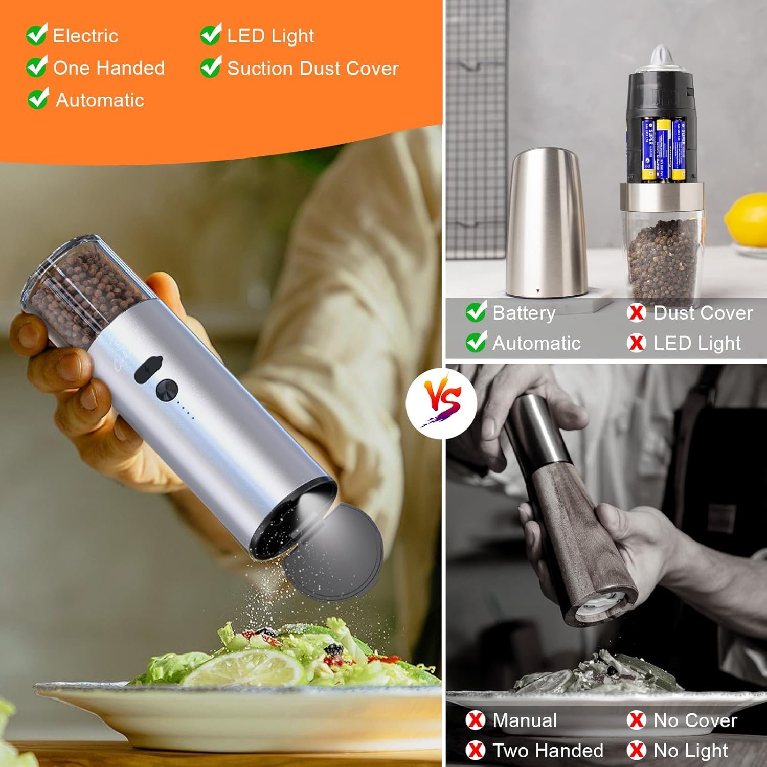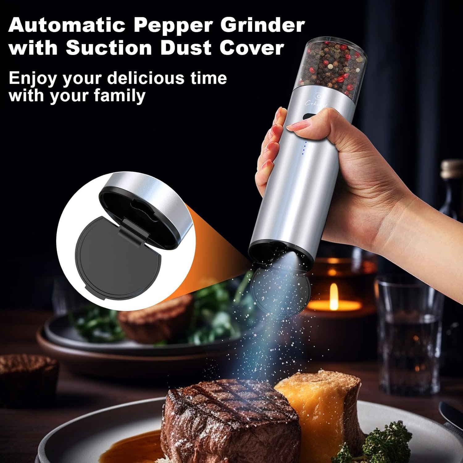 【Adjustable Grind Coarseness】The automatic pepper mill has an adjustable knob at the bottom for selecting the grinding coarseness by turning the dial. The suction dust cover won’t spread condiments all over the table
