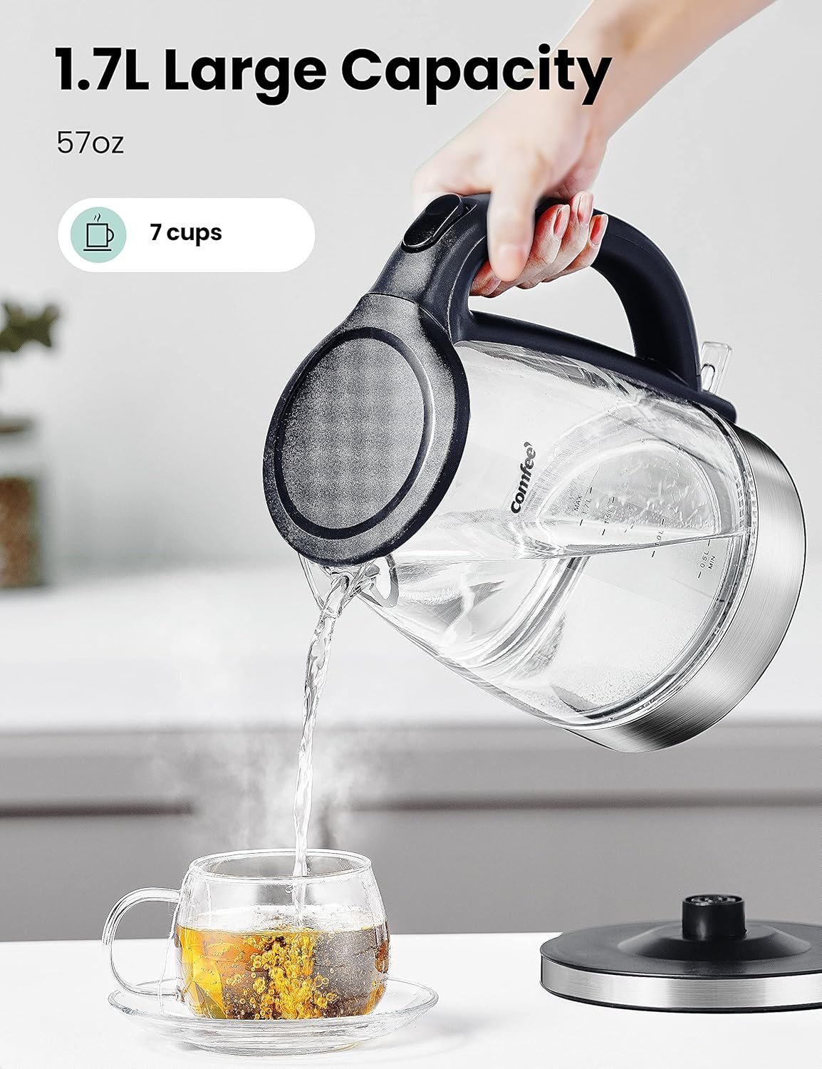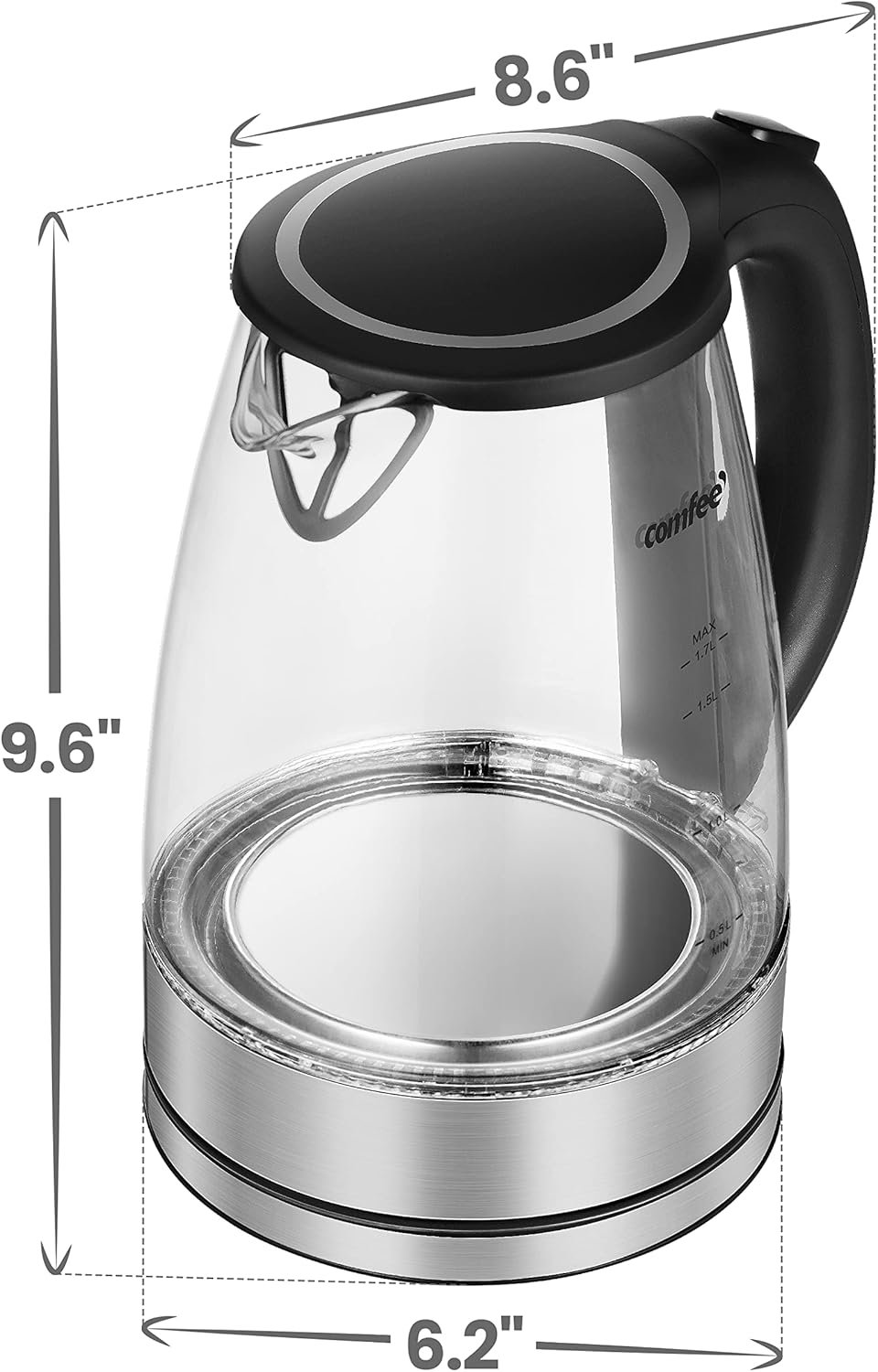 Comfee Glass Cordless Electric Kettle, 1500W Fast Heating with Auto Shut-Off and Boil-Dry Protection, 1.7 Liter.