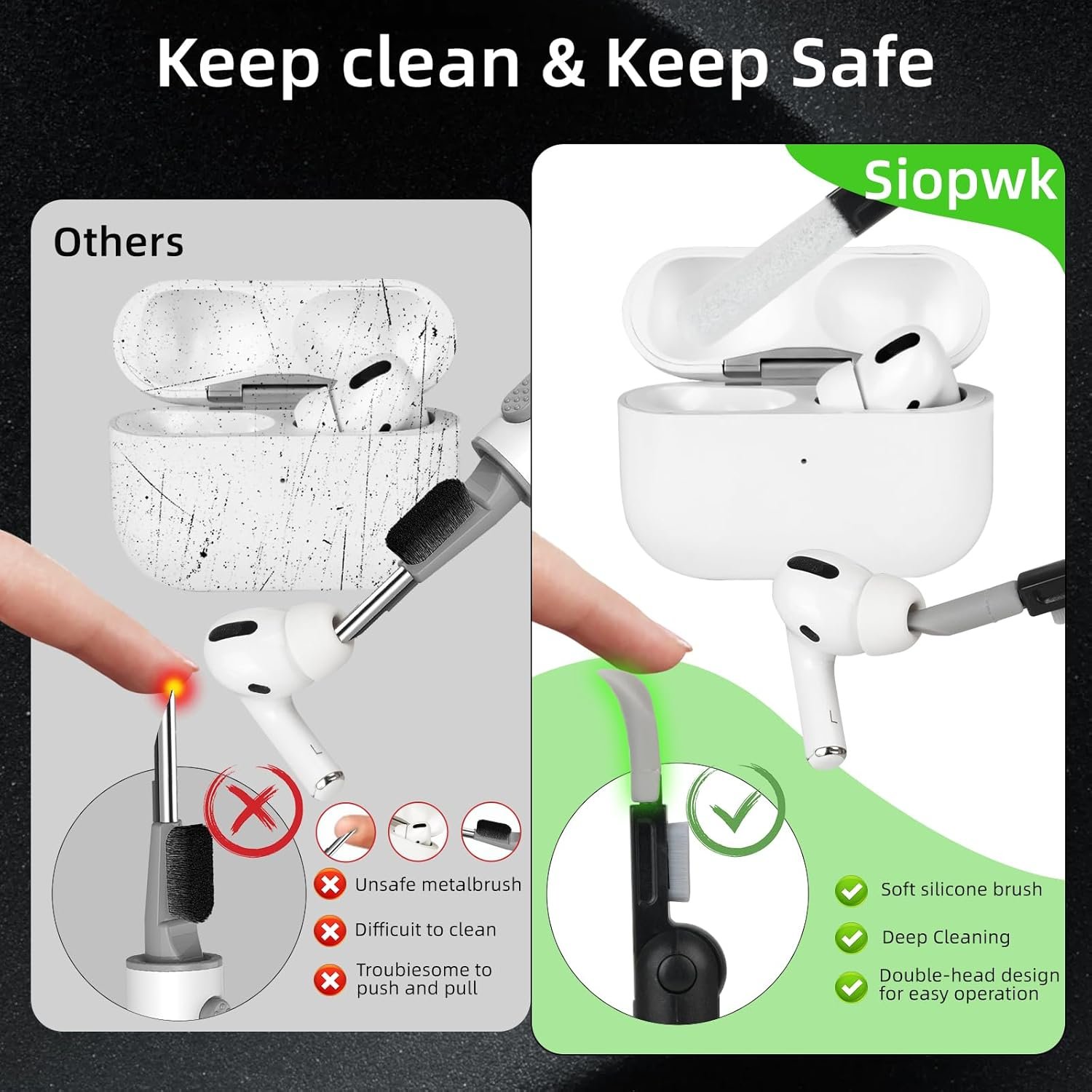 【Portable Carabiner & Earbud Cleaning Pen】The cleaning pen gets rid of any debris or earwax that may have accumulated on your earbuds, while the carabiner clip allows you to easily attach and carry your AirPods Pro/Pro 2 case anywhere you go.